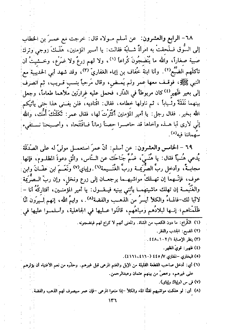 69 - الْخَامِس وَالْعشْرُونَ: عَن أسلم: أَن عمر اسْتعْمل مولى لَهُ على الصَّدَقَة يدعى هنياً فَقَالَ: يَا هني، ضم جناحك عَن النَّاس، وَاتَّقِ دَعْوَة الْمَظْلُوم فَإِنَّهَا مجابةٌ، وَأدْخل رب الصريمة وَرب الْغَنِيمَة. وإياي وَنعم ابْن عَفَّان وَابْن عَوْف، فَإِنَّهُمَا إِن تهْلك مواشيهما يرجعان إِلَى زرع ونخلٍ، وَإِن رب الصريمة وَالْغنيمَة إِن تهْلك ماشيتهما يأتني ببنيه فَيَقُول: يَا أَمِير الْمُؤمنِينَ، أفتاركه أَنا - لَا أَبَا لَك - فالماء والكلأ أيسر من الذَّهَب وَالْفِضَّة. وَايْم الله، إِنَّهُم لَيرَوْنَ أَنا ظلمناهم؛ إِنَّهَا لبلادهم ومياههم، قَاتلُوا عَلَيْهَا فِي الْجَاهِلِيَّة، وَأَسْلمُوا عَلَيْهَا فِي