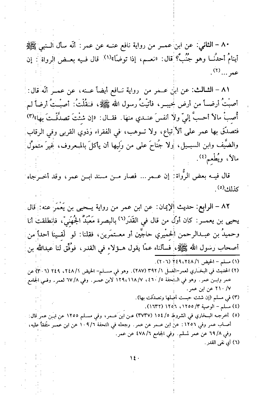 82 - الرَّابِع: حَدِيث الْإِيمَان: عَن ابْن عمر من رِوَايَة يحيى بن يعمر عَنهُ: قَالَ يحيى بن يعمر: كَانَ أول من قَالَ فِي الْقدر بِالْبَصْرَةِ معبدٌ الْجُهَنِيّ، فَانْطَلَقت أَنا وَحميد بن عبد الرَّحْمَن الْحِمْيَرِي حاجين أَو معتمرين، فَقُلْنَا: لَو لَقينَا أحدا من أَصْحَاب رَسُول الله صلى الله عَلَيْهِ وَسلم، فَسَأَلْنَاهُ عَمَّا يَقُول هَؤُلَاءِ فِي الْقدر، فوفق لنا عبد الله بن
