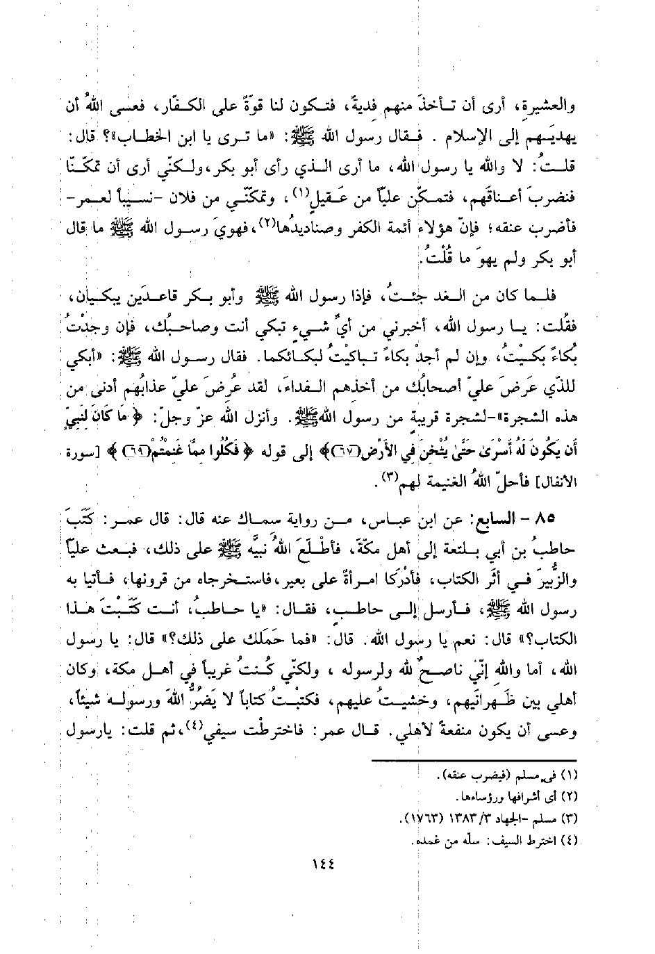 فَلَمَّا كَانَ من الْغَد جِئْت، فَإِذا رَسُول الله صلى الله عَلَيْهِ وَسلم وَأَبُو بكر قَاعِدين يَبْكِيَانِ، فَقلت: يَا رَسُول الله، أَخْبرنِي من أَي شيءٍ تبْكي أَنْت وَصَاحِبك، فَإِن وجدت بكاء بَكَيْت، وَإِن لم أجد بكاء تَبَاكَيْت لِبُكَائِكُمَا. فَقَالَ رَسُول الله صلى الله عَلَيْهِ وَسلم: " أبْكِي للَّذي عرض عَليّ أَصْحَابك من أَخذهم الْفِدَاء، لقد عرض عَليّ عَذَابهمْ أدنى من هَذِه الشَّجَرَة - لشَجَرَة قريبَة من رَسُول الله صلى الله عَلَيْهِ وَسلم. وَأنزل الله عز وَجل: {مَا كَانَ لنَبِيّ أَن يكون لَهُ أسرى حَتَّى يثخن فِي الأَرْض} إِلَى قَوْله {فَكُلُوا مِمَّا غَنِمْتُم} [سُورَة الْأَنْفَال] فأحل الله الْغَنِيمَة لَهُم.