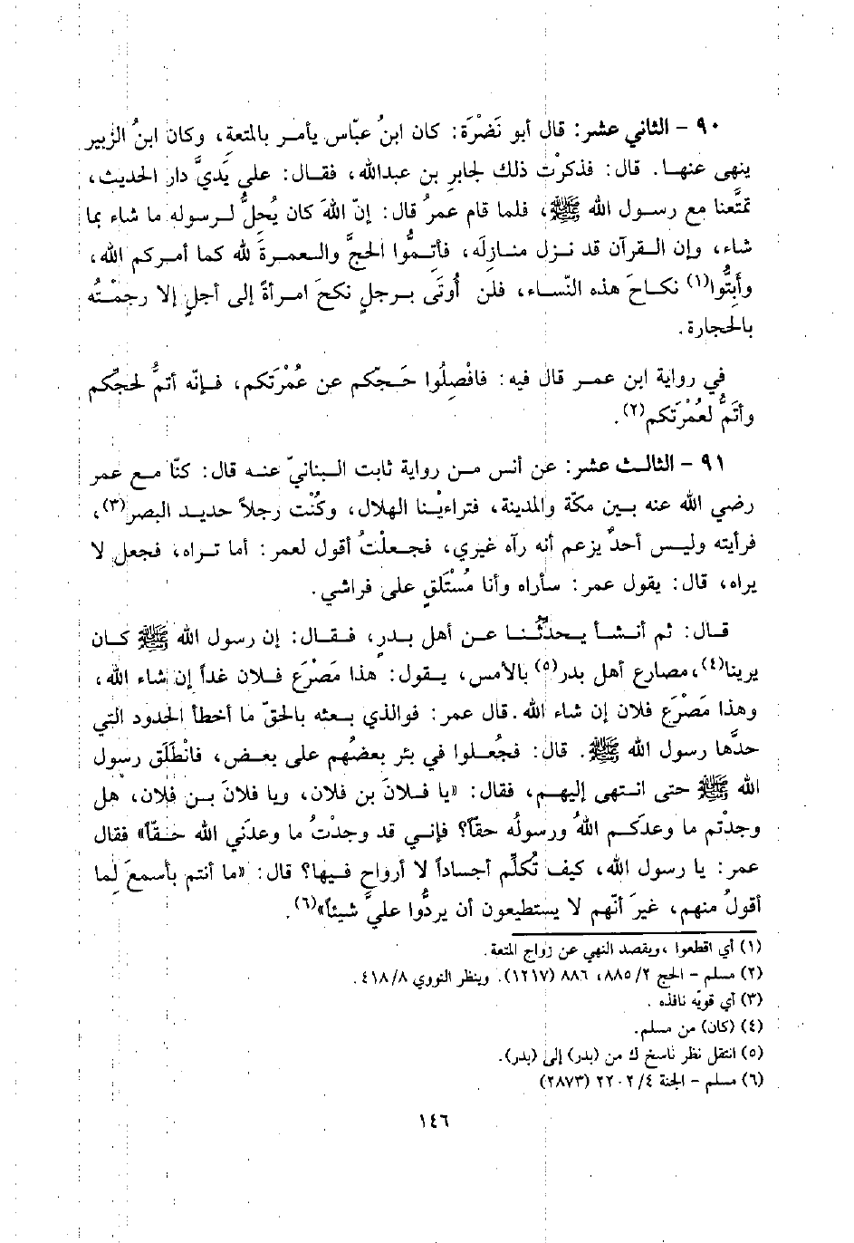 90 - الثَّانِي عشر: قَالَ أَبُو نَضرة: كَانَ ابْن عَبَّاس يَأْمر بِالْمُتْعَةِ، وَكَانَ ابْن الزبير ينْهَى عَنْهَا. قَالَ: فَذكرت ذَلِك لجَابِر بن عبد الله، فَقَالَ: على يَدي دَار الحَدِيث، تَمَتعنَا مَعَ رَسُول الله صلى الله عَلَيْهِ وَسلم، فَلَمَّا قَامَ عمر قَالَ: إِن الله كَانَ يحل لرَسُوله مَا شَاءَ بِمَا شَاءَ، وَإِن الْقُرْآن قد نزل مَنَازِله، فَأتمُّوا الْحَج وَالْعمْرَة لله كَمَا أَمركُم الله، وأبتوا نِكَاح هَذِه النِّسَاء، فَلَنْ أُوتى برجلٍ نكح امْرَأَة إِلَى أجلٍ إِلَّا رَجَمْته بِالْحِجَارَةِ.