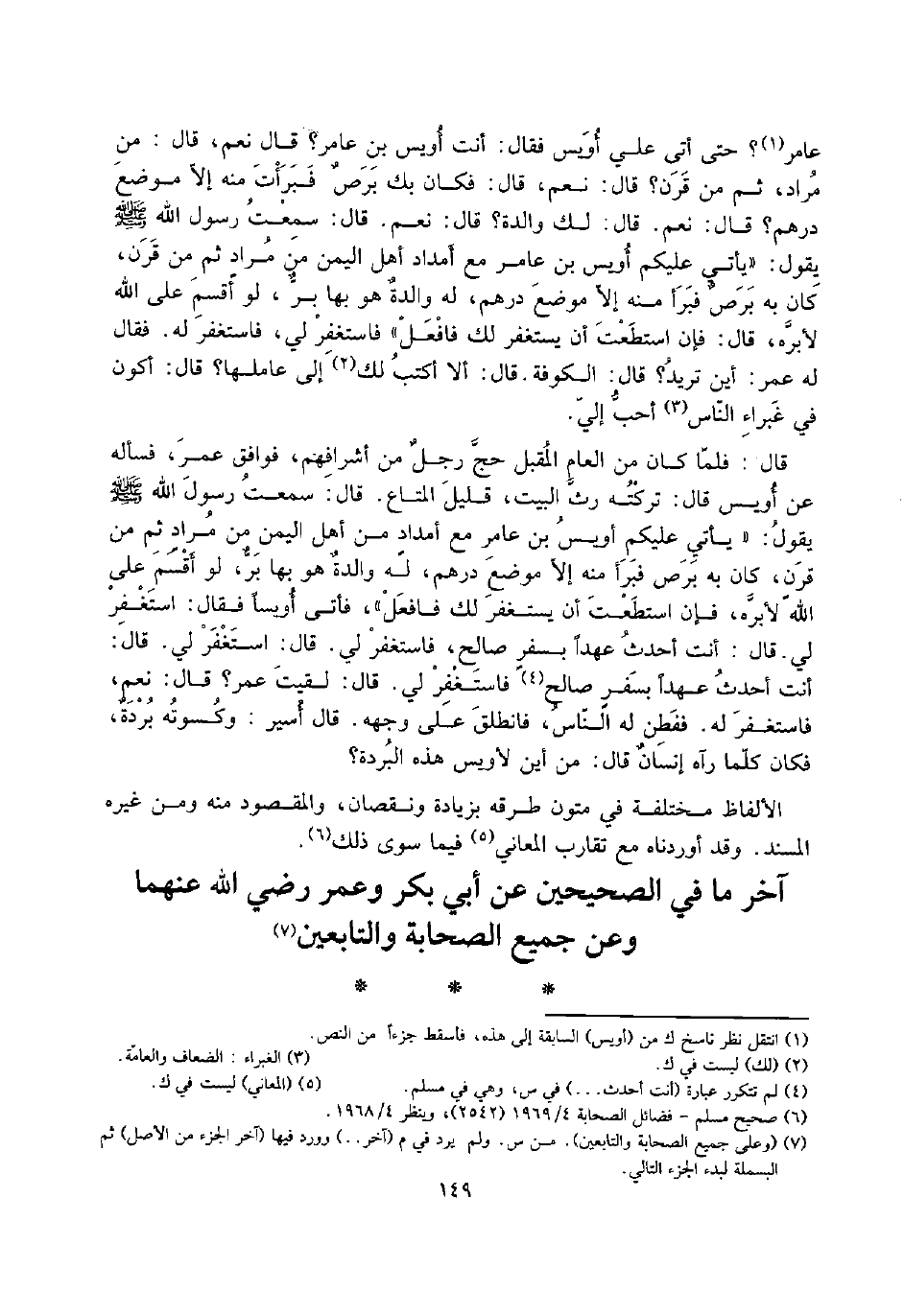 قَالَ: فَلَمَّا كَانَ من الْعَام الْمقبل حج رجلٌ من أَشْرَافهم، فَوَافَقَ عمر، فَسَأَلَهُ عَن أويس قَالَ: تركته رث الْبَيْت، قَلِيل الْمَتَاع. قَالَ: سَمِعت رَسُول الله صلى الله عَلَيْهِ وَسلم يَقُول: " يَأْتِي عَلَيْكُم أويس بن عَامر مَعَ أَمْدَاد من أهل الْيمن من مُرَاد ثمَّ من قرن، كَانَ بِهِ برص فبرأ مِنْهُ إِلَّا مَوضِع دِرْهَم، لَهُ والدةٌ هُوَ بهَا برٌّ، لَو أقسم على الله لَأَبَره، فَإِن اسْتَطَعْت أَن يسْتَغْفر لَك فافعل "، فَأتى أويساً فَقَالَ: اسْتغْفر لي. قَالَ: أَنْت أحدث عهدا بسفر صالحٍ، فَاسْتَغْفر لي. قَالَ: اسْتغْفر لي. قَالَ: أَنْت أحدث عهدا بسفرٍ صَالح فَاسْتَغْفر لي. قَالَ: لقِيت عمر؟ قَالَ: نعم، فَاسْتَغْفر لَهُ. فَفطن لَهُ النَّاس، فَانْطَلق على وَجهه. قَالَ أَسِير: وَكسوته بردة، فَكَانَ كلما رَآهُ إنسانٌ قَالَ: من أَيْن لأويس هَذِه الْبردَة؟