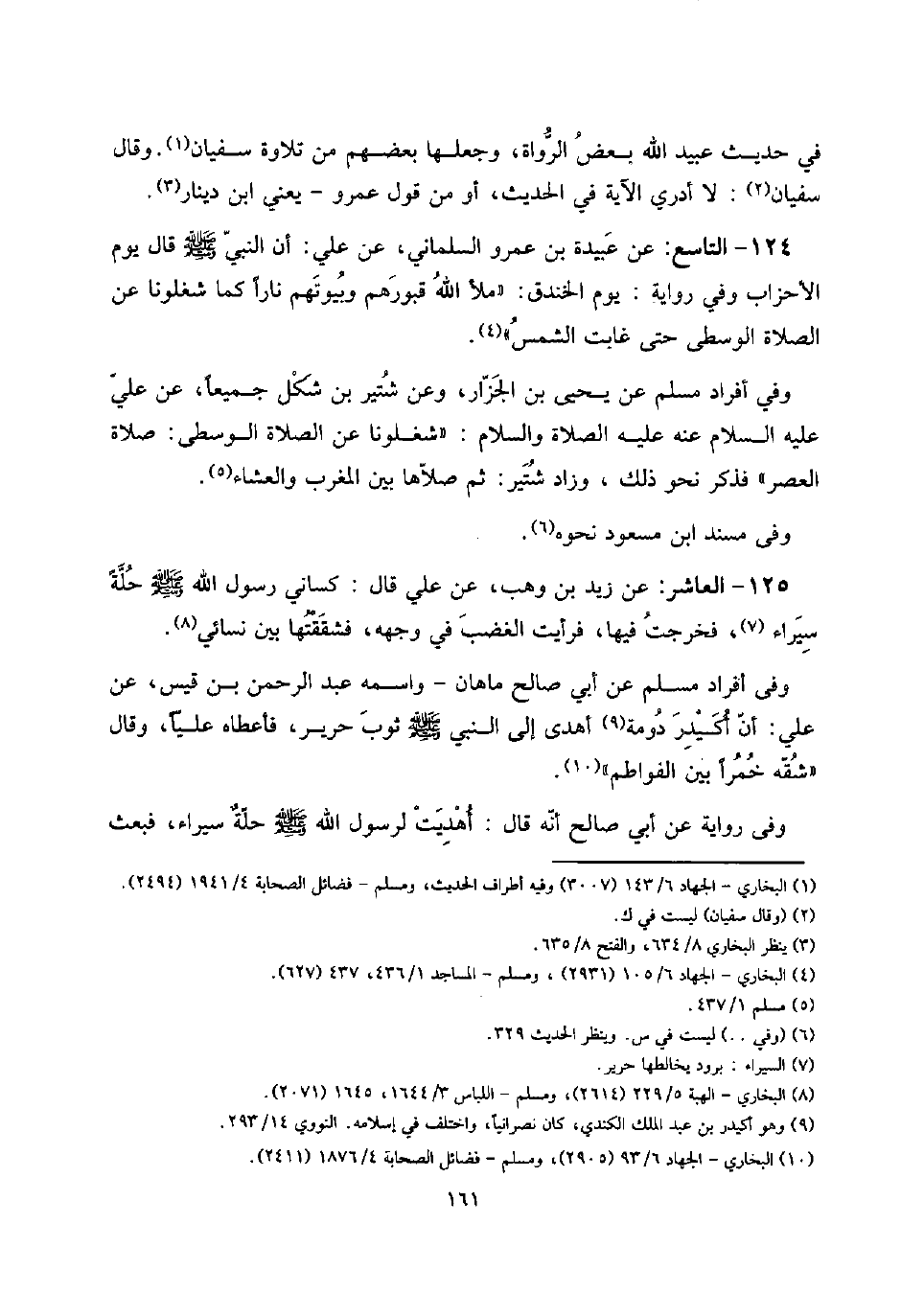 124 - التَّاسِع: عَن عُبَيْدَة بن عَمْرو السَّلمَانِي، عَن عَليّ: أَن النَّبِي صلى الله عَلَيْهِ وَسلم قَالَ يَوْم الْأَحْزَاب وَفِي رِوَايَة: يَوْم الخَنْدَق: " مَلأ الله قُبُورهم وَبُيُوتهمْ نَارا كَمَا شغلونا عَن الصَّلَاة الْوُسْطَى حَتَّى غَابَتْ الشَّمْس ".