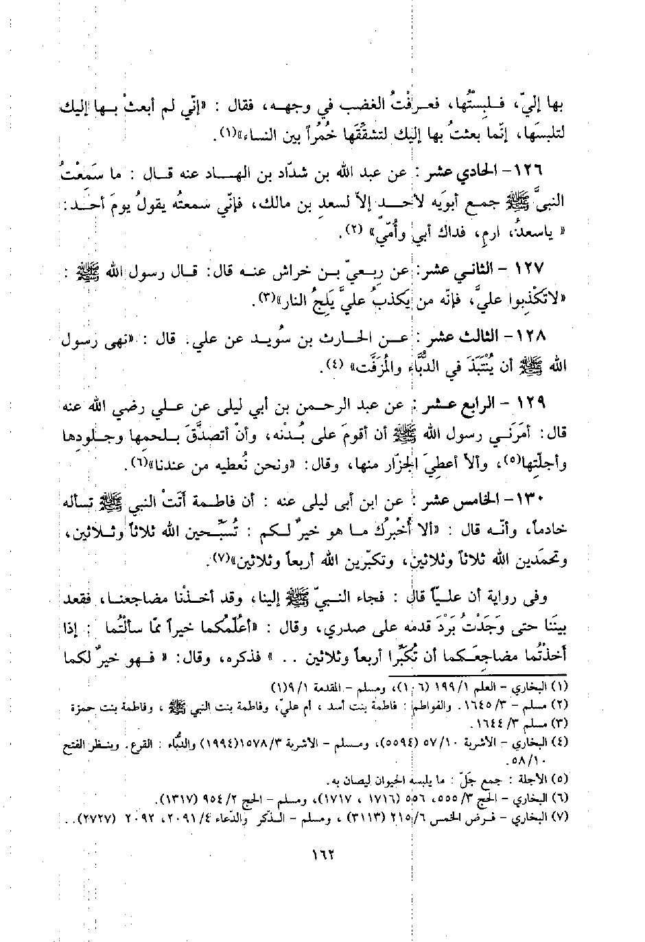 130 - الْخَامِس عشر: عَن ابْن أبي ليلى عَنهُ: أَن فَاطِمَة أَتَت النَّبِي صلى الله عَلَيْهِ وَسلم تسأله خَادِمًا، وَأَنه قَالَ: " أَلا أخْبرك مَا هُوَ خيرٌ لكم: تسبحين الله ثَلَاثًا وَثَلَاثِينَ، وتحمدين الله ثَلَاثًا وَثَلَاثِينَ، وتكبرين الله أَرْبعا وَثَلَاثِينَ ".