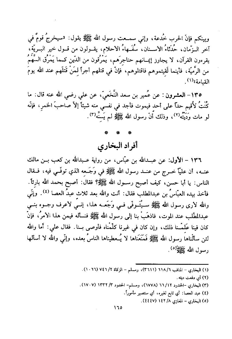 136 - الأول: عَن عبد الله بن عَبَّاس، من رِوَايَة عبد الله بن كَعْب بن مَالك عَنهُ، أَن علياًّ خرج من عِنْد رَسُول الله صلى الله عَلَيْهِ وَسلم فِي وَجَعه الَّذِي توفّي فِيهِ، فَقَالَ النَّاس: يَا أَبَا حسن، كَيفَ أصبح رَسُول الله صلى الله عَلَيْهِ وَسلم؟ فَقَالَ: أصبح بِحَمْد الله بارئاً.