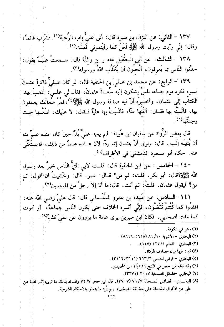 139 - الرَّابِع: عَن مُحَمَّد بن عَليّ بن الْحَنَفِيَّة قَالَ: لَو كَانَ عليٌّ ذَاكِرًا عُثْمَان بسوءٍ ذكره يَوْم جَاءَهُ ناسٌ يَشكونَ إِلَيْهِ سعاة عُثْمَان، فَقَالَ لي عليٍّ: اذْهَبْ بِهَذَا الْكتاب إِلَى عُثْمَان، وَأخْبرهُ أَن فِيهِ صَدَقَة رَسُول الله صلى الله عَلَيْهِ وَسلم، فَمر سعاتك يعْملُونَ بهَا، فَأَتَيْته بهَا فَقَالَ: أغنها عَنَّا، فَأتيت بهَا علياًّ فَقَالَ: لَا عَلَيْك، ضعها حَيْثُ وَجدتهَا.