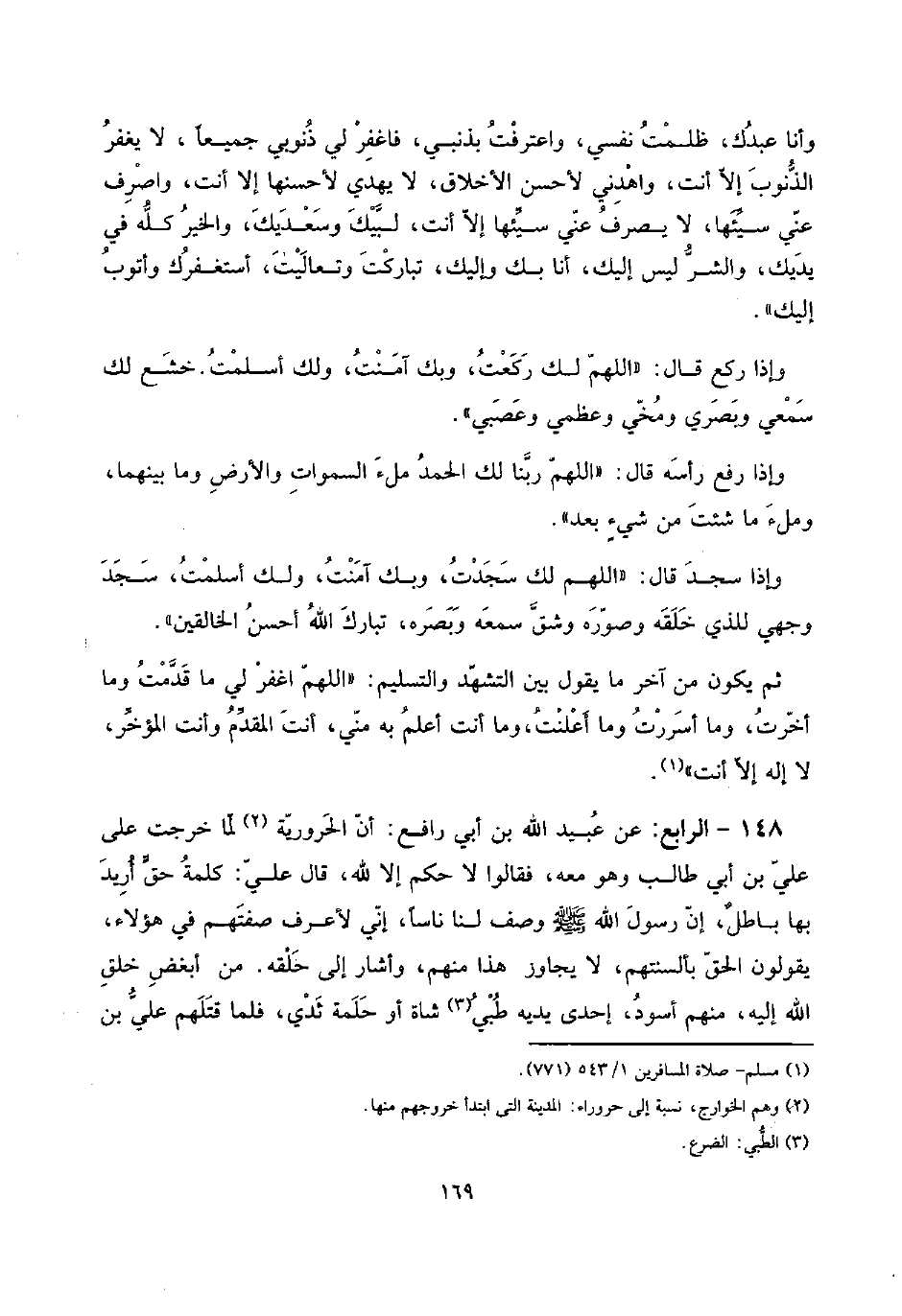 وَأَنا عَبدك، ظلمت نَفسِي، وَاعْتَرَفت بذنبي، فَاغْفِر لي ذُنُوبِي جَمِيعًا، لَا يغْفر الذُّنُوب إِلَّا أَنْت، واهدني لأحسن الْأَخْلَاق، لَا يهدي لأحسنها إِلَّا أَنْت، واصرف عني سيئها، لَا يصرف عني سيئها إِلَّا أَنْت، لبيْك وَسَعْديك، وَالْخَيْر كُله فِي يَديك، وَالشَّر لَيْسَ إِلَيْك، أَنا بك وَإِلَيْك، تَبَارَكت وَتَعَالَيْت، أستغفرك وَأَتُوب إِلَيْك ".