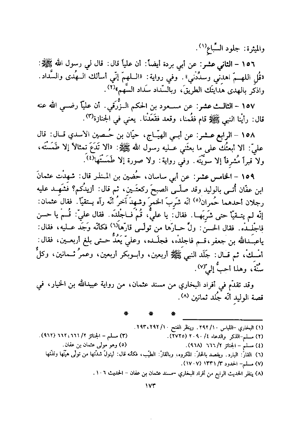157 - الثَّالِث عشر: عَن مَسْعُود بن الحكم الزرقي: أَن عليا رَضِي الله عَنهُ قَالَ: رَأينَا النَّبِي صلى الله عَلَيْهِ وَسلم قَامَ فقمنا، وَقعد فَقَعَدْنَا. يَعْنِي فِي الْجِنَازَة. @ 158 - الرَّابِع عشر: عَن أبي الْهياج، حَيَّان بن حُصَيْن الْأَسدي قَالَ: قَالَ عَليّ: أَلا أَبْعَثك على مَا بَعَثَنِي عَلَيْهِ رَسُول الله صلى الله عَلَيْهِ وَسلم: " أَلا تدع تمثالاً إِلَّا طمسته، وَلَا قبراً مشرفا إِلَّا سويته. وَفِي رِوَايَة: وَلَا صُورَة إِلَّا طمستها.