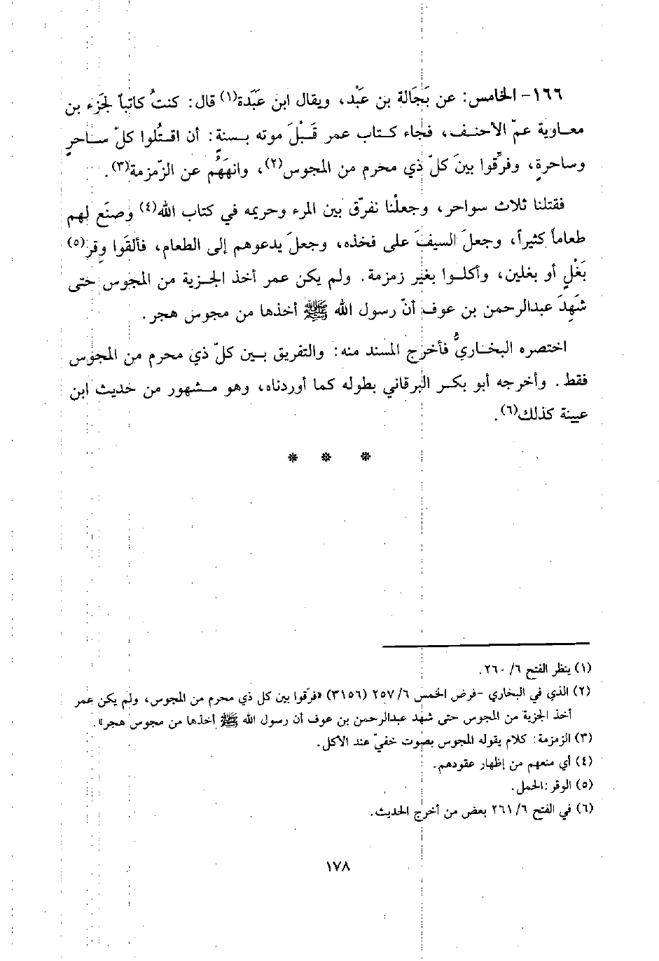 166 - الْخَامِس: عَن بجالة بن عبد، وَيُقَال ابْن عَبدة قَالَ: كنت كَاتبا لجزء بن مُعَاوِيَة عَم الْأَحْنَف، فجَاء كتاب عمر قبل مَوته بسنةٍ: أَن أقتلوا كل ساحرٍ وساحرةٍ، وَفرقُوا بَين كل ذِي محرم من الْمَجُوس، وانههم عَن الزمزمة.