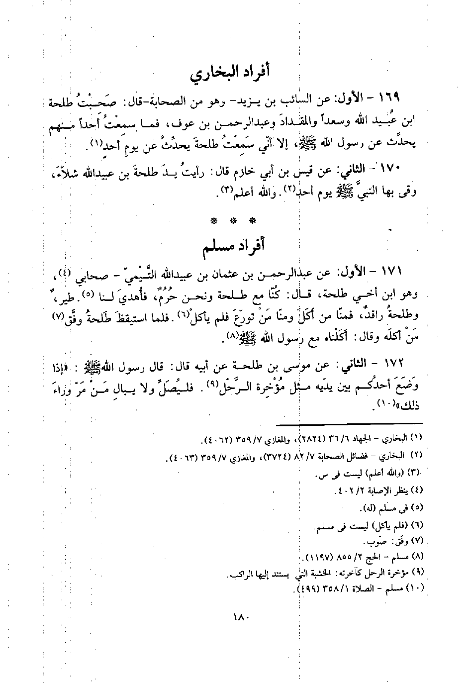 169 - الأول: عَن السَّائِب بن يزِيد - وَهُوَ من الصَّحَابَة - قَالَ: صَحِبت طَلْحَة ابْن عبيد الله وسعداً والمقداد وَعبد الرَّحْمَن بن عَوْف، فَمَا سَمِعت أحدا مِنْهُم يحدث عَن رَسُول الله صلى الله عَلَيْهِ وَسلم، إِلَّا أَنِّي سَمِعت طَلْحَة يحدث عَن يَوْم أحدٍ.