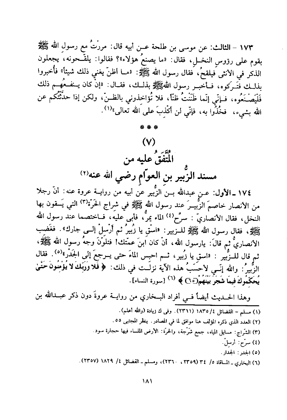 174 - الأول: عَن عبد الله بن الزبير عَن أَبِيه من رِوَايَة عُرْوَة عَنهُ: أَن رجلا من الْأَنْصَار خَاصم الزبير عِنْد رَسُول الله صلى الله عَلَيْهِ وَسلم فِي شراج الْحرَّة الَّتِي يسقون بهَا النّخل، فَقَالَ الْأنْصَارِيّ: سرح المَاء يمر، فَأبى عَلَيْهِ، فاختصما عِنْد رَسُول الله صلى الله عَلَيْهِ وَسلم، فَقَالَ رَسُول الله صلى الله عَلَيْهِ وَسلم للزبير: " اسْقِ يَا زبير ثمَّ أرسل إِلَى جَارك ". فَغَضب الْأنْصَارِيّ ثمَّ قَالَ: يَا رَسُول الله، أَن كَانَ ابْن عَمَّتك! فَتَلَوَّنَ وَجه رَسُول الله صلى الله عَلَيْهِ وَسلم، ثمَّ قَالَ للزبير: " اسْقِ يَا زبير، ثمَّ احْبِسْ المَاء حَتَّى يرجع إِلَى الْجدر ". فَقَالَ الزبير: وَالله إِنِّي لأحسب هَذِه الْآيَة نزلت فِي ذَلِك: {فَلَا وَرَبك لَا يُؤمنُونَ حَتَّى يُحَكِّمُوك فِيمَا شجر بَينهم} [سُورَة النِّسَاء] .