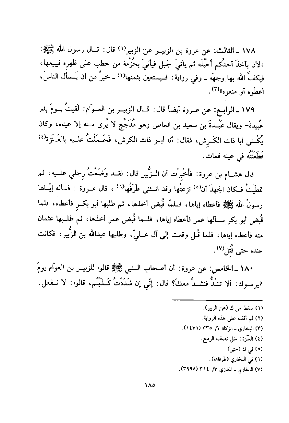 178 - الثَّالِث: عَن عُرْوَة بن الزبير عَن الزبير قَالَ: قَالَ رَسُول الله صلى الله عَلَيْهِ وَسلم: " لِأَن يَأْخُذ أحدكُم أحبله ثمَّ يَأْتِي الْجَبَل فَيَأْتِي بحزمة من حطب على ظَهره فيبيعها، فيكف الله بهَا وَجهه - وَفِي رِوَايَة: فيستعين بِثمنِهَا - خيرٌ من أَن يسْأَل النَّاس، أَعْطوهُ أَو منعُوهُ ".