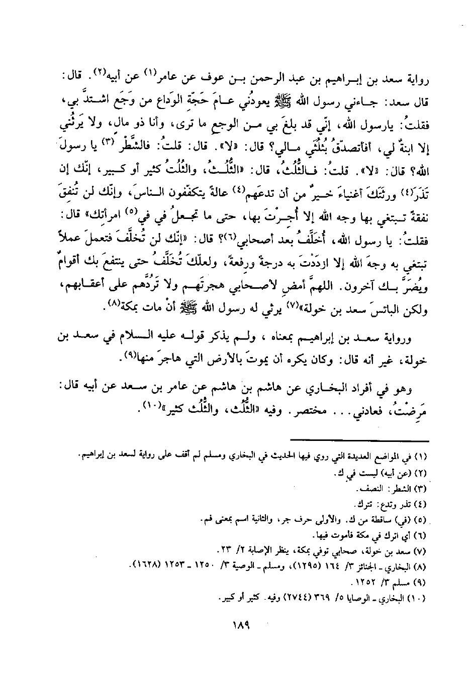 رِوَايَة سعد بن إِبْرَاهِيم بن عبد الرَّحْمَن بن عَوْف عَن عَامر عَن أَبِيه. قَالَ: قَالَ سعد: جَاءَنِي رَسُول الله صلى الله عَلَيْهِ وَسلم يعودنِي عَام حجَّة الْوَدَاع من وجع اشْتَدَّ بِي، فَقلت: يَا رَسُول الله، إِنِّي قد بلغ بِي من الوجع مَا ترى، وَأَنا ذُو مالٍ، وَلَا يَرِثنِي إِلَّا ابنةٌ لي، أفأتصدق بِثُلثي مَالِي؟ قَالَ: " لَا ". قَالَ: قلت: فَالشَّطْر يَا رَسُول الله؟ قَالَ: " لَا ". قلت: فَالثُّلُث، قَالَ: " الثُّلُث، وَالثلث كثير أَو كَبِير، إِنَّك إِن تذر وَرثتك أَغْنِيَاء خيرٌ من أَن تَدعهُمْ عَالَة يَتَكَفَّفُونَ النَّاس، وَإنَّك لن تنْفق نَفَقَة تبتغي بهَا وَجه الله إِلَّا أجرت بهَا، حَتَّى مَا تجْعَل فِي فِي امْرَأَتك " قَالَ: فَقلت: يَا رَسُول الله، أخلف بعد أَصْحَابِي؟ قَالَ: " إِنَّك لن تخلف فتعمل عملا تبتغي بِهِ وَجه الله إِلَّا ازددت بِهِ دَرَجَة ورفعةً، ولعلك تخلف حَتَّى ينْتَفع بك أقوامٌ ويضر بك آخَرُونَ. اللَّهُمَّ أمض لِأَصْحَابِي هجرتهم وَلَا تردهم على أَعْقَابهم، وَلَكِن البائس سعد بن خَوْلَة " يرثي لَهُ رَسُول الله صلى الله عَلَيْهِ وَسلم أَن مَاتَ بِمَكَّة.