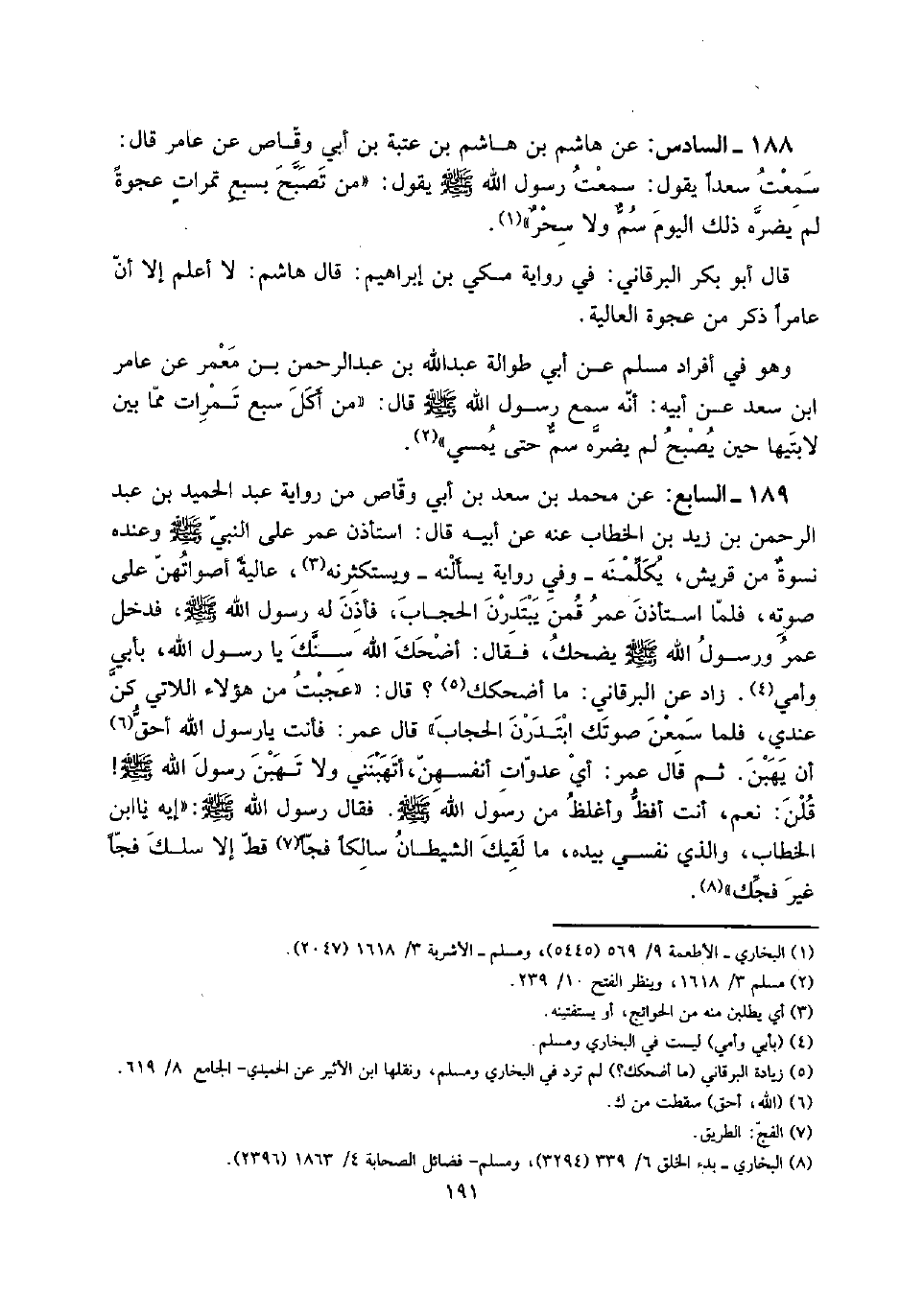 188 - السَّادِس: عَن هَاشم بن هَاشم بن عتبَة بن أبي وَقاص عَن عَامر قَالَ: سَمِعت سَعْدا يَقُول: سَمِعت رَسُول الله صلى الله عَلَيْهِ وَسلم يَقُول: " من تصبح بسبعٍ تمراتٍ عَجْوَة لم يضرّهُ ذَلِك الْيَوْم سمٌّ وَلَا سحرٌ ".