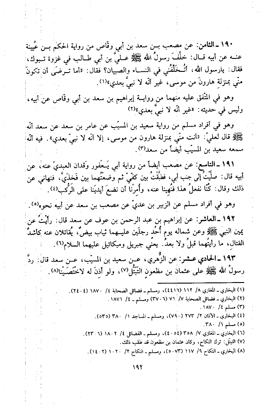 190 - الثَّامِن: عَن مُصعب بن سعد بن أبي وَقاص من رِوَايَة الحكم بن عُيَيْنَة عَنهُ عَن أَبِيه قَالَ: خلف رَسُول الله صلى الله عَلَيْهِ وَسلم عَليّ بن أبي طَالب فِي غَزْوَة تَبُوك، فَقَالَ: يَا رَسُول الله، أتخلفني فِي النِّسَاء وَالصبيان؟ فَقَالَ: " أما ترْضى أَن تكون مني بِمَنْزِلَة هَارُون من مُوسَى، غير أَنه لَا نَبِي بعدِي ".