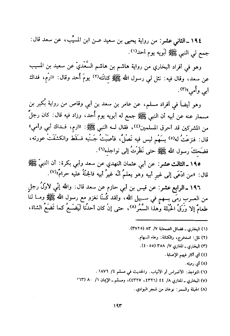 196 - الرَّابِع عشر: عَن قيس بن أبي حَازِم عَن سعد قَالَ: وَالله إِنِّي لأوّل رجلٍ من الْعَرَب رمى بسهمٍ فِي سَبِيل الله، وَلَقَد كُنَّا نغزو مَعَ رَسُول الله صلى الله عَلَيْهِ وَسلم وَمَا لنا طعامٌ إِلَّا ورقٌ الحبلة وَهَذَا السمر، حَتَّى إِن كَانَ أَحَدنَا ليضع كَمَا تضع الشَّاة،