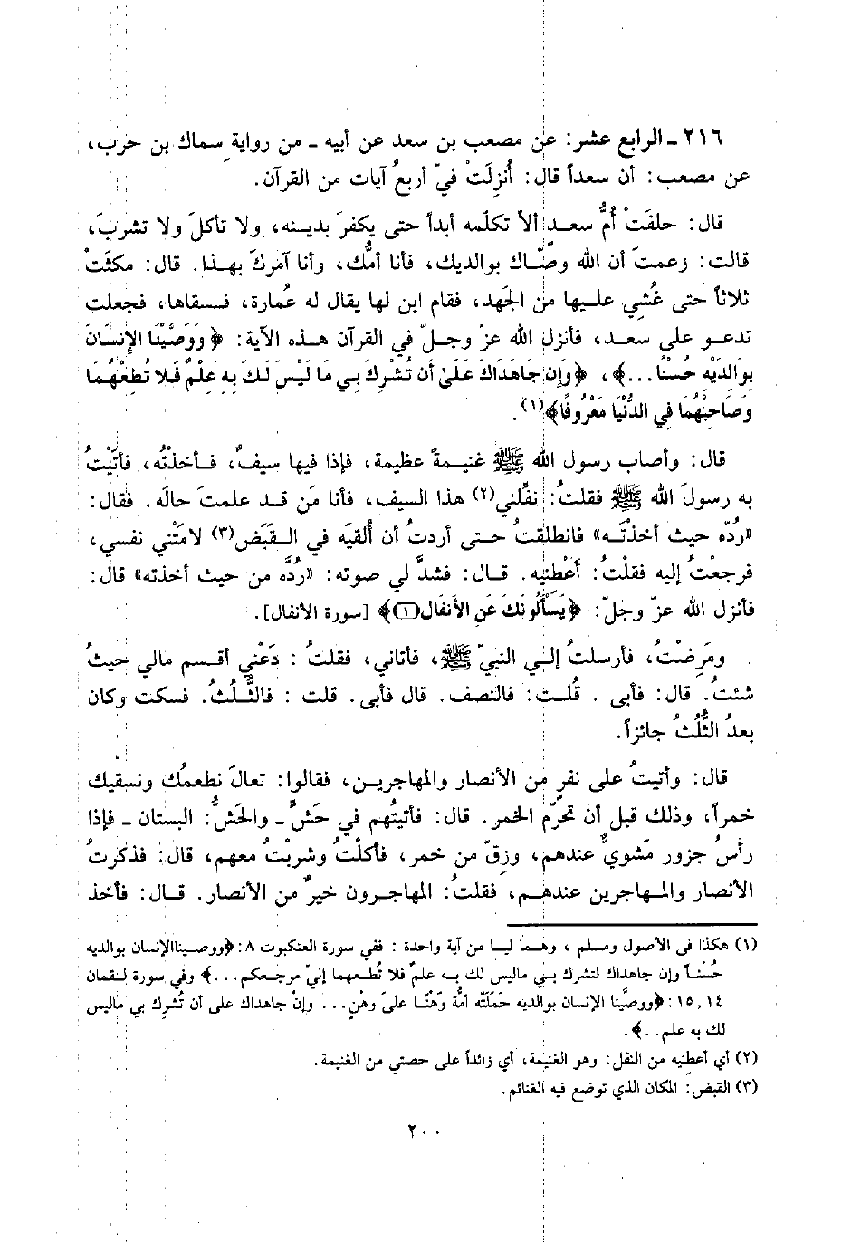 216 - الرَّابِع عشر: عَن مُصعب بن سعد عَن أَبِيه - من رِوَايَة سماك بن حَرْب، عَن مُصعب: أَن سَعْدا قَالَ: أنزلت فِي أَربع آيَات من الْقُرْآن.