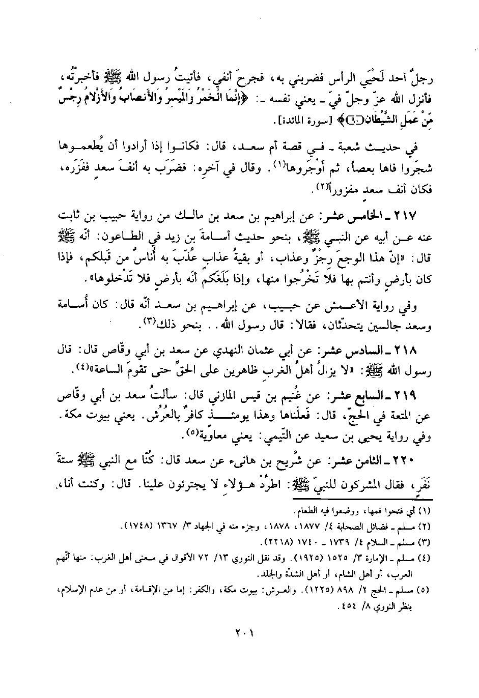 220 - الثَّامِن عشر: عَن شُرَيْح بن هَانِئ عَن سعد قَالَ: كُنَّا مَعَ النَّبِي صلى الله عَلَيْهِ وَسلم سِتَّة نفرٍ، فَقَالَ الْمُشْركُونَ للنَّبِي صلى الله عَلَيْهِ وَسلم: اطرد هَؤُلَاءِ لَا يجترئون علينا. قَالَ: وَكنت أَنا،