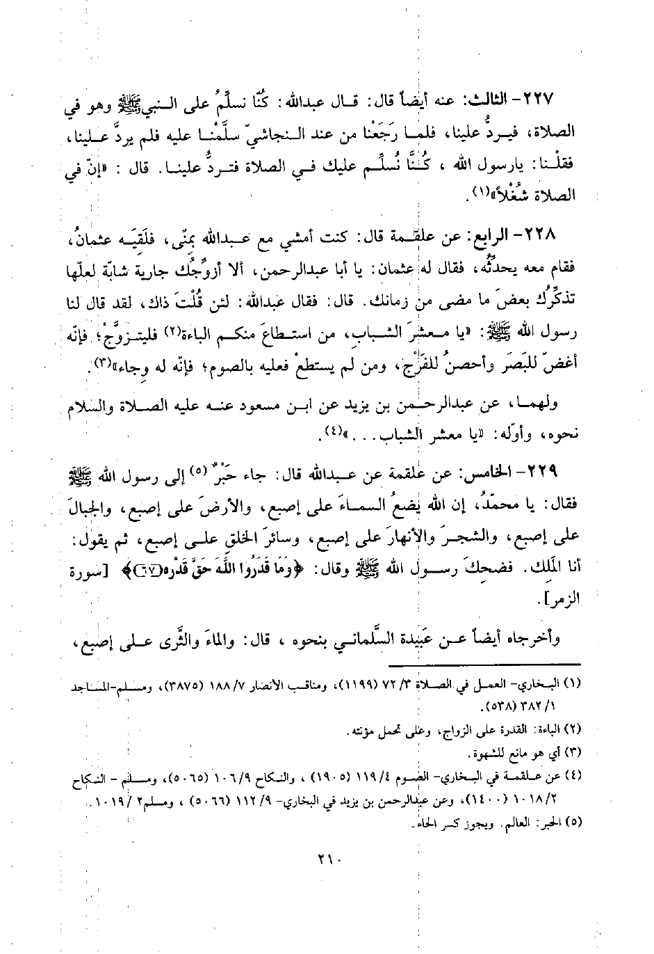 228 - الرَّابِع: عَن عَلْقَمَة قَالَ: كنت أَمْشِي مَعَ عبد الله بمنى، فَلَقِيَهُ عُثْمَان، فَقَامَ مَعَه يحدثه، فَقَالَ لَهُ عُثْمَان: يَا أَبَا عبد الرَّحْمَن، أَلا أزَوجك جَارِيَة شَابة لَعَلَّهَا تذكرك بعض مَا مضى من زَمَانك. قَالَ: فَقَالَ عبد الله: لَئِن قلت ذَاك، لقد قَالَ لنا رَسُول الله صلى الله عَلَيْهِ وَسلم: " يَا معشر الشَّبَاب، من اسْتَطَاعَ مِنْكُم الْبَاءَة فليتزوج؛ فَإِنَّهُ أَغضّ لِلْبَصَرِ وَأحْصن لِلْفَرجِ، وَمن لم يسْتَطع فَعَلَيهِ بِالصَّوْمِ؛ فَإِنَّهُ لَهُ وَجَاء ".