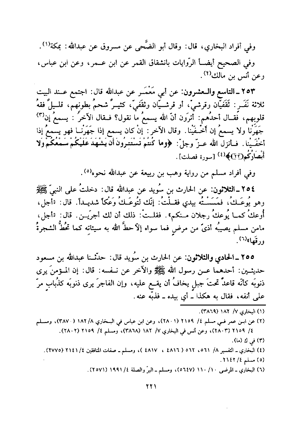 253 - التَّاسِع وَالْعشْرُونَ: عَن أبي معمر عَن عبد الله قَالَ: اجْتمع عِنْد الْبَيْت ثَلَاثَة نفرٍ: ثقفيان وقرشي، أَو قرشيان، وثقفي، كثيرٌ شَحم بطونهم، قليلٌ فقه قُلُوبهم، فَقَالَ أحدهم: أَتَرَوْنَ أَن الله يسمع مَا نقُول؟ فَقَالَ الآخر: يسمع إِن جهرنا وَلَا يسمع إِن أخفينا. وَقَالَ الآخر: إِن كَانَ يسمع إِذا جهرنا فَهُوَ يسمع إِذا أخفينا. فَأنْزل الله عز وَجل: {وَمَا كُنْتُم تستترون أَن يشْهد عَلَيْكُم سمعكم وَلَا أبصاركم} [سُورَة فصلت] .
