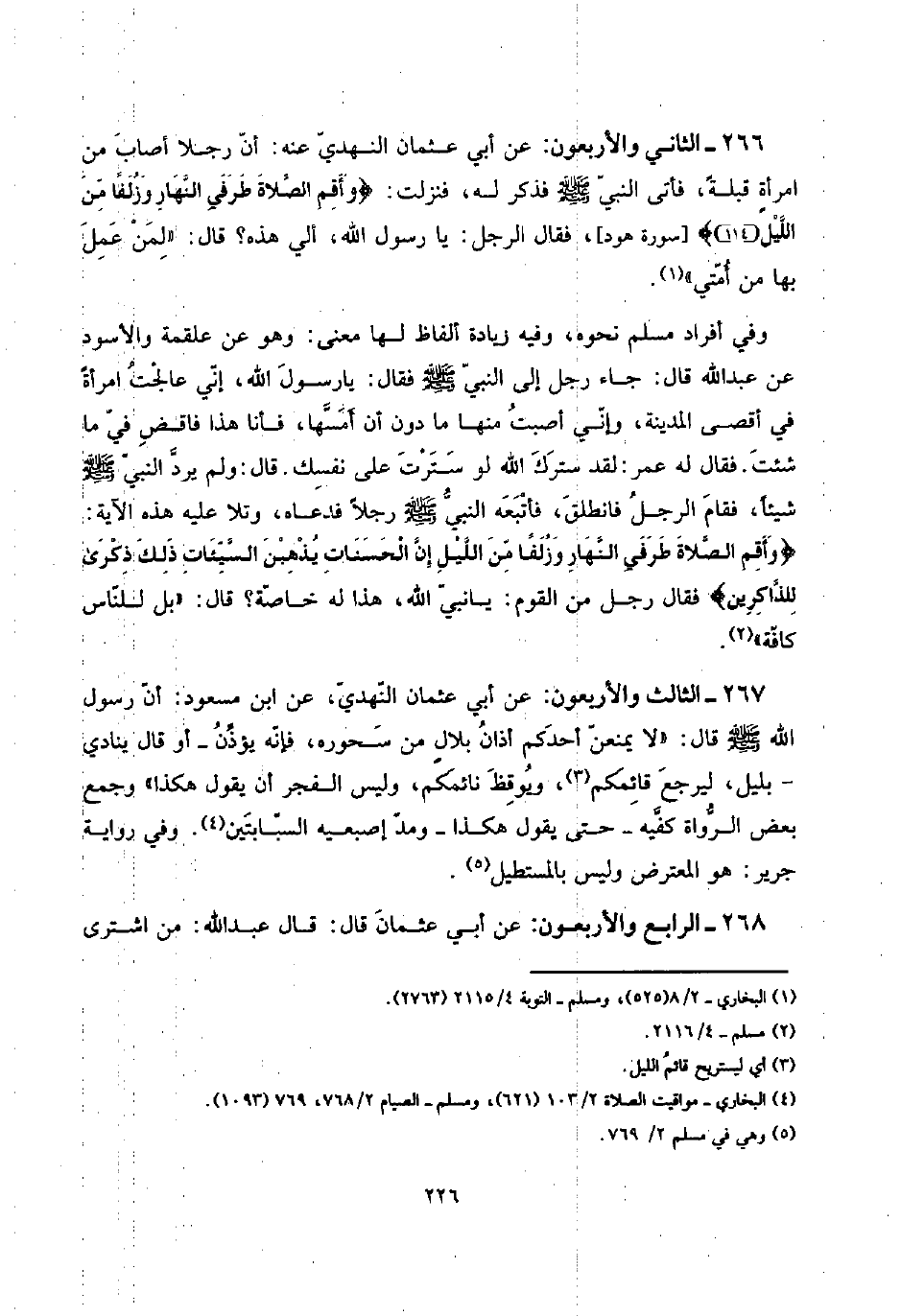 266 - الثَّانِي وَالْأَرْبَعُونَ: عَن أبي عُثْمَان النَّهْدِيّ عَنهُ: أَن رجلا أصَاب من امرأةٍ قبْلَة، فَأتى النَّبِي صلى الله عَلَيْهِ وَسلم فَذكر لَهُ، فَنزلت: {وأقم الصَّلَاة طرفِي النَّهَار وَزلفًا من اللَّيْل} [سُورَة هود] ، فَقَالَ الرجل: يَا رَسُول الله، أَلِي هَذِه؟ قَالَ: " لمن عمل بهَا من أمتِي ".