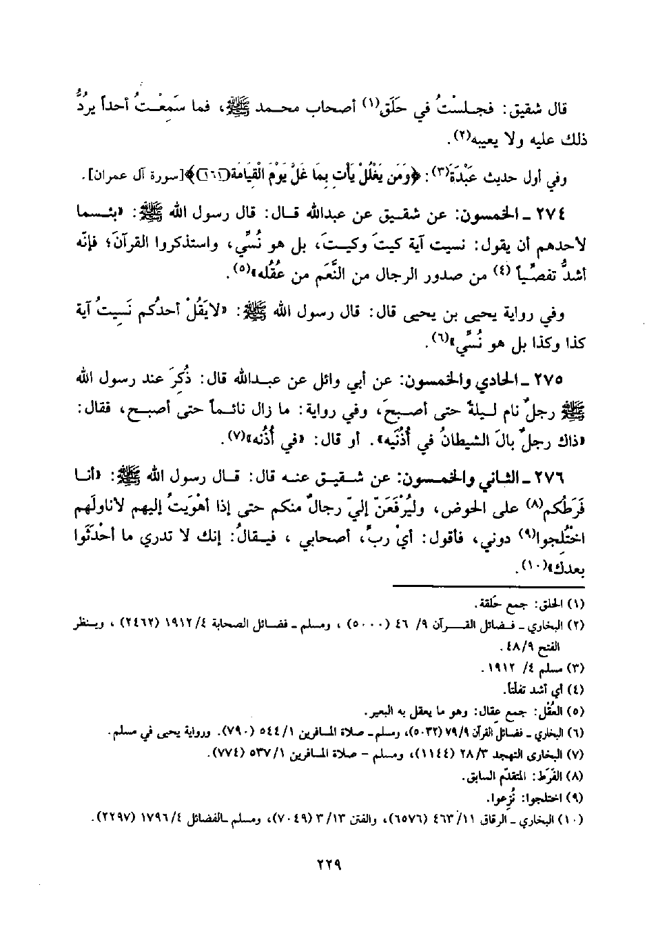 274 - الْخَمْسُونَ: عَن شَقِيق عَن عبد الله قَالَ: قَالَ رَسُول الله صلى الله عَلَيْهِ وَسلم: " بئْسَمَا لأَحَدهم أَن يَقُول: نسيت آيَة كَيْت وَكَيْت، بل هُوَ نسي، واستذكروا الْقُرْآن؛ فَإِنَّهُ أَشد تفصياً من صُدُور الرِّجَال من النعم من عقله ".