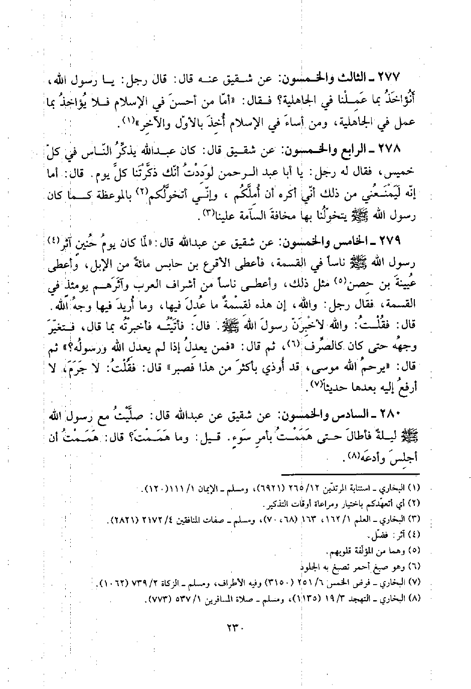 279 - الْخَامِس وَالْخَمْسُونَ: عَن شَقِيق عَن عبد الله قَالَ: " لما كَانَ يَوْم حنينٍ آثر رَسُول الله صلى الله عَلَيْهِ وَسلم نَاسا فِي الْقِسْمَة، فَأعْطى الْأَقْرَع بن حَابِس مائَة من الْإِبِل، وَأعْطى عُيَيْنَة بن حصن مثل ذَلِك، وَأعْطى نَاسا من أَشْرَاف الْعَرَب وآثرهم يومئذٍ فِي الْقِسْمَة، فَقَالَ رجل: وَالله، إِن هَذِه لقسمةٌ مَا عدل فِيهَا، وَمَا أُرِيد فِيهَا وَجه الله.