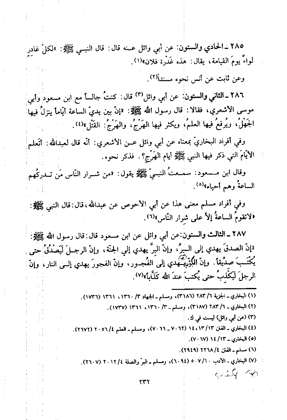 286 - الثَّانِي وَالسِّتُّونَ: عَن أبي وَائِل قَالَ: كنت جَالِسا مَعَ ابْن مَسْعُود وَأبي مُوسَى الْأَشْعَرِيّ، فَقَالَا: قَالَ رَسُول الله صلى الله عَلَيْهِ وَسلم: " إِن بَين يَدي السَّاعَة أَيَّامًا ينزل فِيهَا الْجَهْل، وَيرْفَع فِيهَا الْعلم، وَيكثر فِيهَا الْهَرج، والهرج: الْقَتْل ".