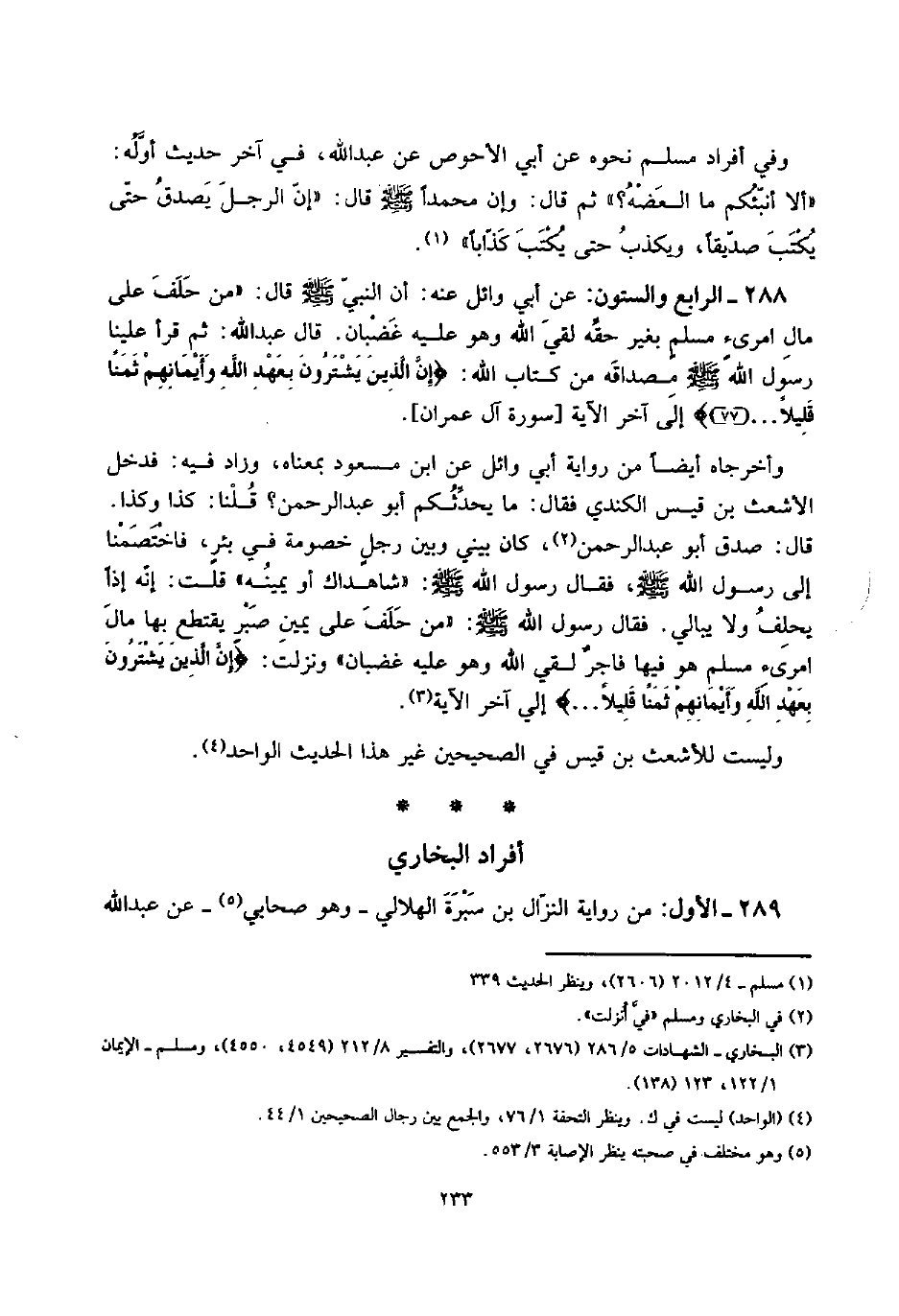 288 - الرَّابِع وَالسِّتُّونَ: عَن أبي وَائِل عَنهُ: أَن النَّبِي صلى الله عَلَيْهِ وَسلم قَالَ: " من حلف على مَال امرئٍ مسلمٍ بِغَيْر حَقه لَقِي الله وَهُوَ عَلَيْهِ غَضْبَان. قَالَ عبد الله: ثمَّ قَرَأَ علينا رَسُول الله صلى الله عَلَيْهِ وَسلم مصداقه من كتاب الله: {إِن الَّذين يشْتَرونَ بِعَهْد الله وَأَيْمَانهمْ ثمنا قَلِيلا} إِلَى آخر الْآيَة [سُورَة آل عمرَان] .