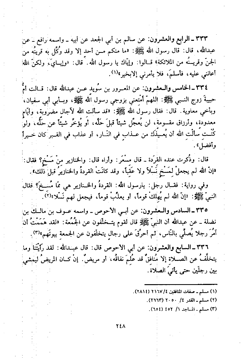 335 - السَّادِس وَالْعشْرُونَ: عَن أبي الْأَحْوَص - واسْمه عَوْف بن مَالك بن نَضْلَة - عَن عبد الله أَن النَّبِي صلى الله عَلَيْهِ وَسلم قَالَ لقوم يتخلفون عَن الْجُمُعَة: " لقد هَمَمْت أَن آمُر رجلا يُصَلِّي بِالنَّاسِ، ثمَّ أحرق على رجالٍ يتخلفون عَن الْجُمُعَة بُيُوتهم ".