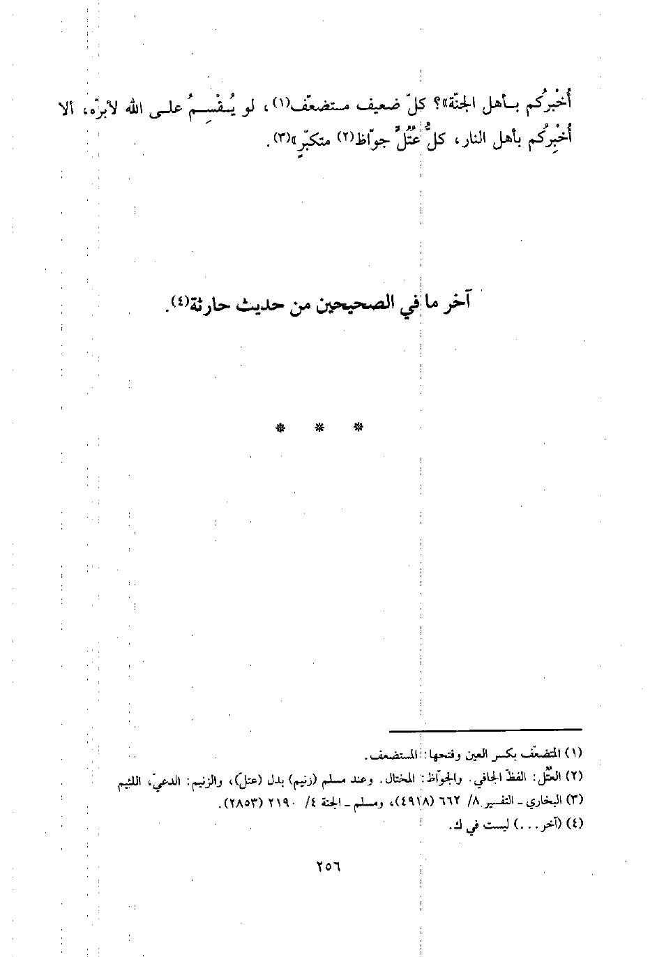 أخْبركُم بِأَهْل الْجنَّة "؟ كل ضَعِيف متضعف، لَو يقسم على الله لَأَبَره، أَلا أخْبركُم بِأَهْل النَّار، كل عتل جواظ متكبرٍ ".