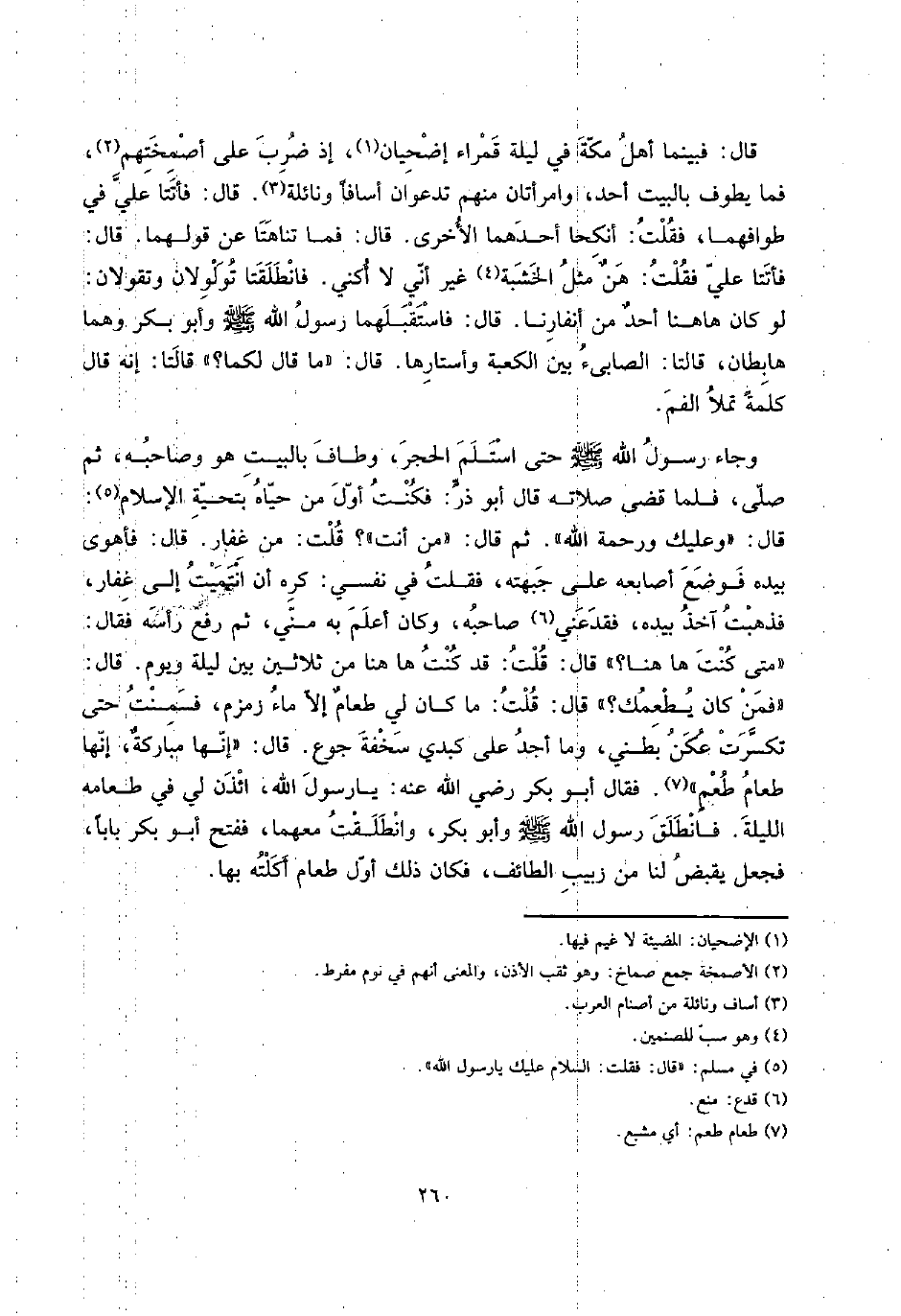 وَجَاء رَسُول الله صلى الله عَلَيْهِ وَسلم حَتَّى اسْتَلم الْحجر، وَطَاف بِالْبَيْتِ هُوَ وَصَاحبه، ثمَّ صلى، فَلَمَّا قضى صلَاته قَالَ أَبُو ذَر: فَكنت أول من حَيَّاهُ بِتَحِيَّة الْإِسْلَام: قَالَ: " وَعَلَيْك وَرَحْمَة الله ". ثمَّ قَالَ: " من أَنْت "؟ قلت: من غفار. قَالَ: فَأَهوى بِيَدِهِ فَوضع أَصَابِعه على جَبهته، فَقلت فِي نَفسِي: كره أَن انتميت إِلَى غفار، فَذَهَبت آخذ بِيَدِهِ، فقدعني صَاحبه، وَكَانَ أعلم بِهِ مني، ثمَّ رفع رَأسه فَقَالَ: " مَتى كنت هَا هُنَا؟ " قَالَ: قلت: قد كنت هَا هُنَا من ثَلَاثِينَ بَين لَيْلَة وَيَوْم. قَالَ: " فَمن كَانَ يطعمك؟ " قَالَ: قلت: مَا كَانَ لي طعامٌ إِلَّا مَاء زَمْزَم، فَسَمنت حَتَّى تَكَسَّرَتْ عُكَن بَطْني، وَمَا أجد على كَبِدِي سخْفَة جوع. قَالَ: " إِنَّهَا مباركةٌ، إِنَّهَا طَعَام طعمٍ. فَقَالَ أَبُو بكر رَضِي الله عَنهُ: يَا رَسُول الله، ائْذَنْ لي فِي طَعَامه اللَّيْلَة. فَانْطَلق رَسُول الله صلى الله عَلَيْهِ وَسلم وَأَبُو بكر، وَانْطَلَقت مَعَهُمَا، فَفتح أَبُو بكر بَابا، فَجعل يقبض لنا من زبيب الطَّائِف، فَكَانَ ذَلِك أول طَعَام أَكلته بهَا.