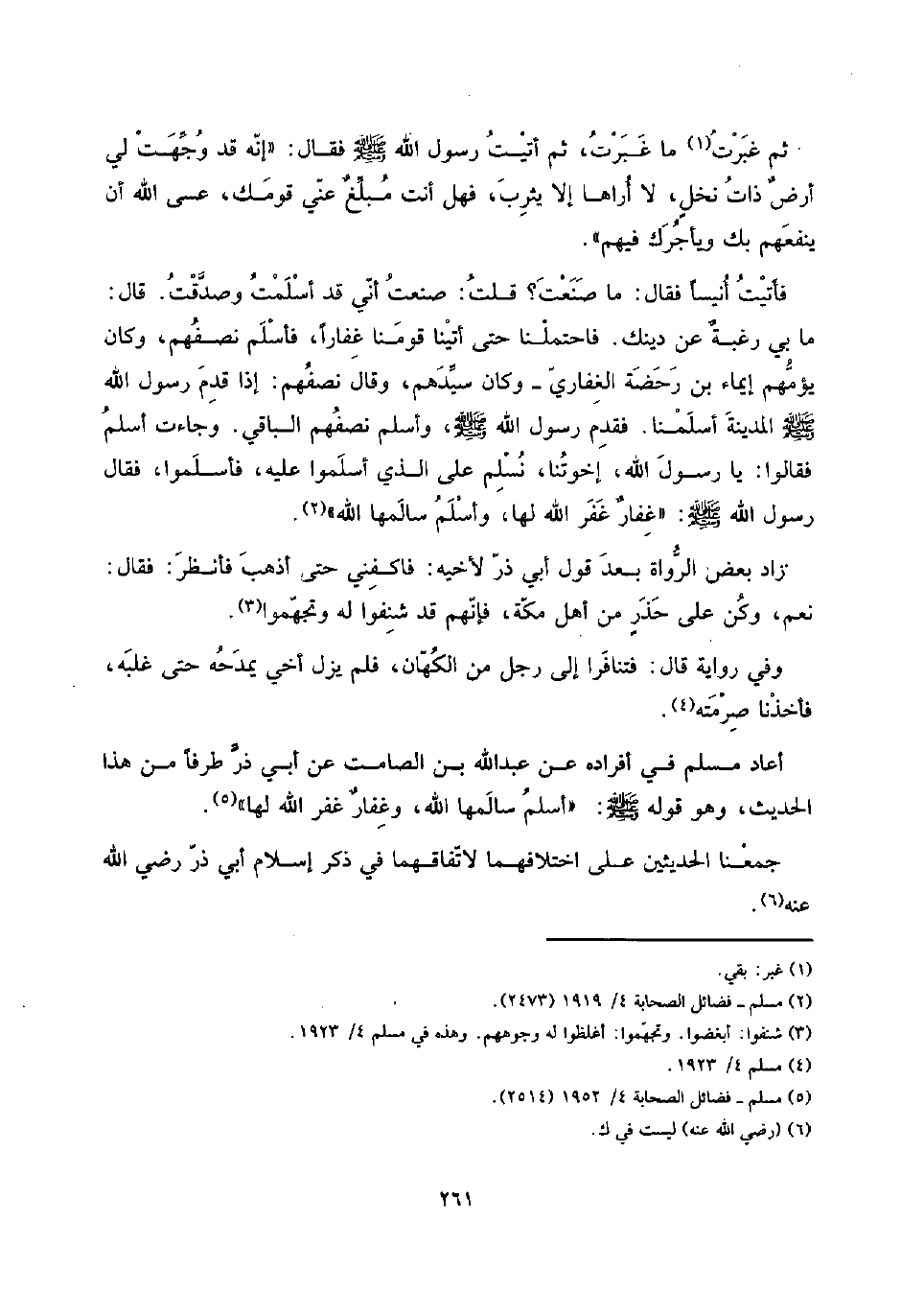 فَأتيت أنيساً فَقَالَ: مَا صنعت؟ قلت: صنعت أَنِّي قد أسلمت وصدقت. قَالَ: مَا بِي رغبةٌ عَن دينك. فَاحْتَمَلْنَا حَتَّى أَتَيْنَا قَومنَا غفارًا، فَأسلم نصفهم، وَكَانَ يؤمهم إِيمَاء بن رحضة الْغِفَارِيّ - وَكَانَ سيدهم، وَقَالَ نصفهم: إِذا قدم رَسُول الله صلى الله عَلَيْهِ وَسلم الْمَدِينَة أسلمنَا. فَقدم رَسُول الله صلى الله عَلَيْهِ وَسلم، وَأسلم نصفهم الْبَاقِي. وَجَاءَت أسلم فَقَالُوا: يَا رَسُول الله، إخوتنا، نسلم على الَّذِي أَسْلمُوا عَلَيْهِ، فأسلموا، فَقَالَ رَسُول الله صلى الله عَلَيْهِ وَسلم: " غفارٌ غفر الله لَهَا، وَأسلم سَالَمَهَا الله ".