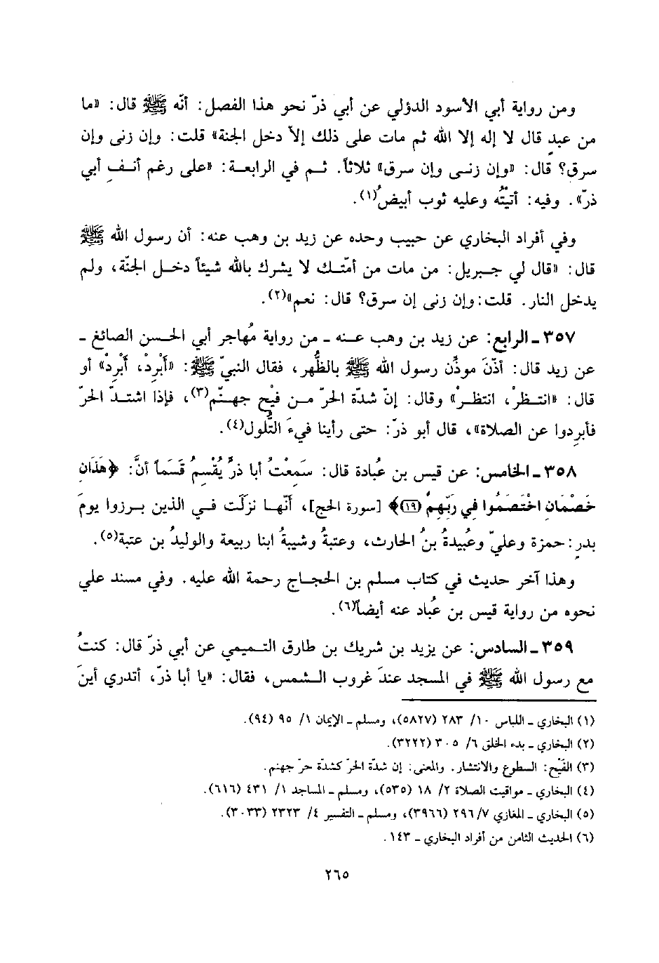 358 - الْخَامِس: عَن قيس بن عبَادَة قَالَ: سَمِعت أَبَا ذَر يقسم قسما أَن: {هَذَانِ خصمان اخْتَصَمُوا فِي رَبهم} [سُورَة الْحَج] ، أَنَّهَا نزلت فِي الَّذين برزوا يَوْم بدرٍ: حَمْزَة وَعلي وَعبيدَة بن الْحَارِث، وَعتبَة وَشَيْبَة ابْنا ربيعَة والوليد بن عتبَة.