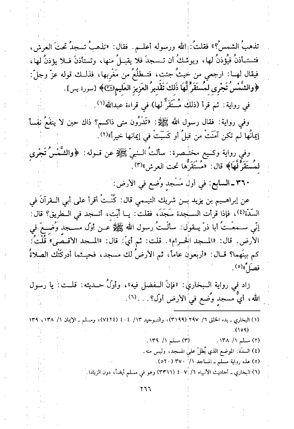 تذْهب الشَّمْس؟ " فَقلت: الله وَرَسُوله أعلم. فَقَالَ: " تذْهب تسْجد تَحت الْعَرْش، فَتَسْتَأْذِن فَيُؤذن لَهَا، ويوشك أَن تسْجد فَلَا يقبل مِنْهَا، وتستأذن فَلَا يُؤذن لَهَا، فَيُقَال لَهَا: ارجعي من حَيْثُ جِئْت، فَتَطلع من مغْرِبهَا، فَذَلِك قَوْله عز وَجل: {وَالشَّمْس تجْرِي لمستقر لَهَا ذَلِك تَقْدِير الْعَزِيز الْعَلِيم} [سُورَة يس] .