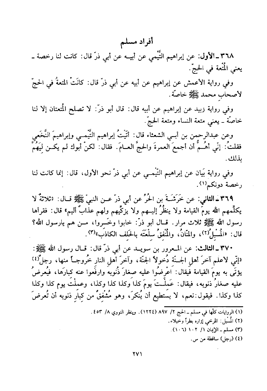 369 - الثَّانِي: عَن خَرشَة بن الْحر عَن أبي ذَر عَن النَّبِي صلى الله عَلَيْهِ وَسلم قَالَ: " ثلاثةٌ لَا يكلمهم الله يَوْم الْقِيَامَة وَلَا ينظر إِلَيْهِم وَلَا يزكيهم وَلَهُم عذابٌ أَلِيم " قَالَ: فقرأها رَسُول الله صلى الله عَلَيْهِ وَسلم ثَلَاث مرار. قَالَ أَبُو ذَر: خابوا وخسروا، من هم يَا رَسُول الله؟ قَالَ: " المسبل، والمنان، والمنفق سلْعَته بِالْحلف الْكَاذِب ".