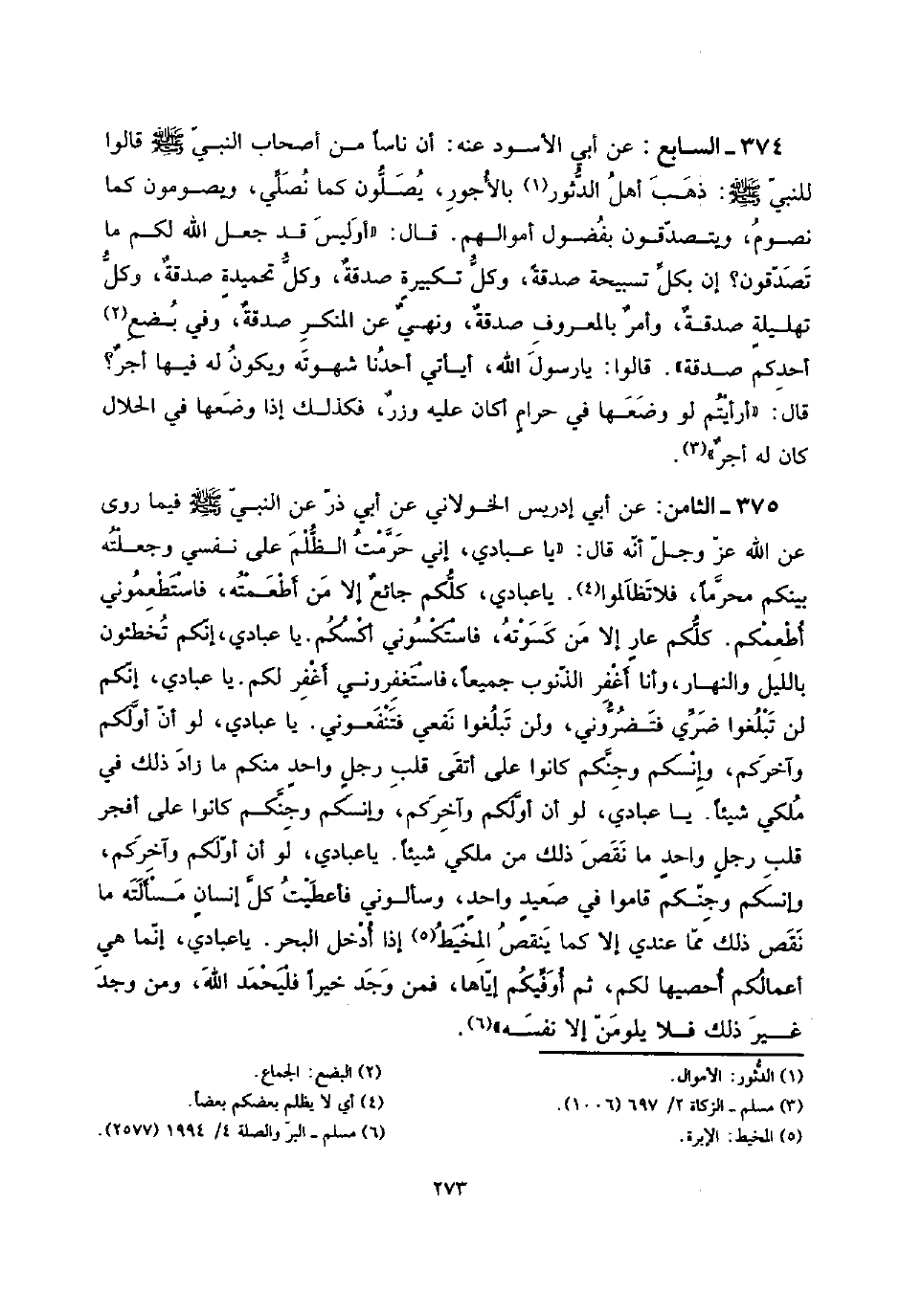 375 - الثَّامِن: عَن أبي إِدْرِيس الْخَولَانِيّ عَن أبي ذَر عَن النَّبِي صلى الله عَلَيْهِ وَسلم فِيمَا روى عَن الله عز وَجل أَنه قَالَ: " يَا عبَادي، إِنِّي حرمت الظُّلم على نَفسِي وَجَعَلته بَيْنكُم محرما، فَلَا تظالموا. يَا عبَادي، كلكُمْ جائعٌ إِلَّا من أطعمته، فاستطعموني أطْعمكُم. كلكُمْ عارٍ إِلَّا من كسوته، فاستكسوني أكسكم. يَا عبَادي، إِنَّكُم تخطئون بِاللَّيْلِ وَالنَّهَار، وَأَنا أَغفر الذُّنُوب جَمِيعًا، فاستغفروني أَغفر لكم. يَا عبَادي، إِنَّكُم لن تبلغوا ضري فتضروني، وَلنْ تبلغوا نفعي فتنفعوني. يَا عبَادي، لَو أَن أولكم وآخركم، وإنسكم وجنكم كَانُوا على أتقى قلب رجلٍ واحدٍ مِنْكُم مَا زَاد ذَلِك فِي ملكي شَيْئا. يَا عبَادي، لَو أَن أولكم وآخركم، وإنسكم وجنكم كَانُوا على أفجر قلب رجلٍ واحدٍ مَا نقص ذَلِك من ملكي شَيْئا. يَا عبَادي، لَو أَن أولكم وآخركم، وإنسكم وجنكم قَامُوا فِي صعيدٍ واحدٍ، وسألوني فَأعْطيت كل إنسانٍ مَسْأَلته مَا نقص ذَلِك مِمَّا عِنْدِي إِلَّا كَمَا ينقص الْمخيط إِذا أَدخل الْبَحْر. يَا عبَادي، إِنَّمَا هِيَ أَعمالكُم أحصيها لكم، ثمَّ أوفيكم إِيَّاهَا، فَمن وجد خيرا فليحمد الله، وَمن وجد غير ذَلِك فَلَا يَلُومن إِلَّا نَفسه ".