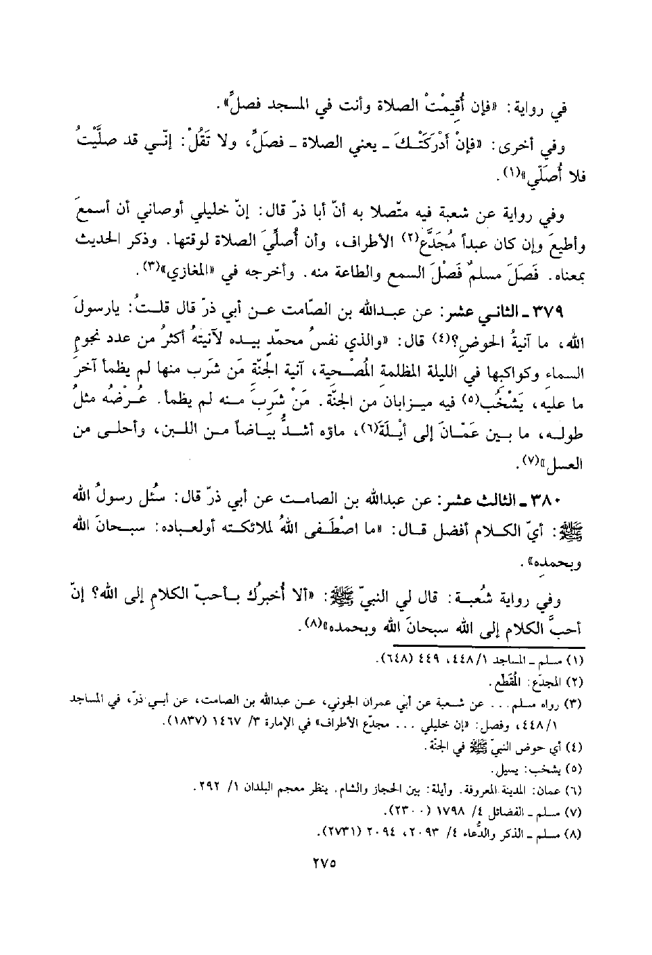 380 - الثَّالِث عشر: عَن عبد الله بن الصَّامِت عَن أبي ذَر قَالَ: سُئِلَ رَسُول الله صلى الله عَلَيْهِ وَسلم: أَي الْكَلَام أفضل قَالَ: " مَا اصْطفى الله لملائكته أَو لِعِبَادِهِ: سُبْحَانَ الله وَبِحَمْدِهِ ".