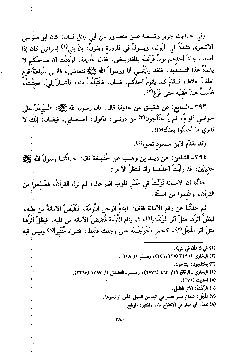 393 - السَّابِع: عَن شَقِيق عَن حُذَيْفَة قَالَ: قَالَ رَسُول الله صلى الله عَلَيْهِ وَسلم: " ليردن على حَوْضِي أقوامٌ، ثمَّ يختلجون من دوني، فَأَقُول: أَصْحَابِي، فَيُقَال: إِنَّك لَا تَدْرِي مَا أَحْدَثُوا بعْدك ".