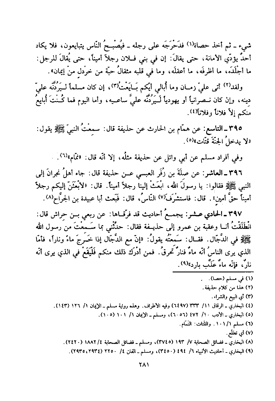 397 - الْحَادِي عشر: يجمع أَحَادِيث قد فرقاها: عَن ربعي بن حِرَاش قَالَ: انْطَلَقت أَنا وَعقبَة بن عَمْرو إِلَى حُذَيْفَة فَقَالَ: حَدثنِي بِمَا سَمِعت من رَسُول الله صلى الله عَلَيْهِ وَسلم فِي الدَّجَّال. فَقَالَ: سمعته يَقُول: " إِن مَعَ الدَّجَّال إِذا خرج مَاء وَنَارًا، فَأَما الَّذِي يرى النَّاس أَنه ماءٌ فنارٌ تحرق. فَمن أدْرك ذَلِك مِنْكُم فليقع فِي الَّذِي يرى أَنه نارٌ، فَإِنَّهُ ماءٌ عذبٌ بَارِد ".
