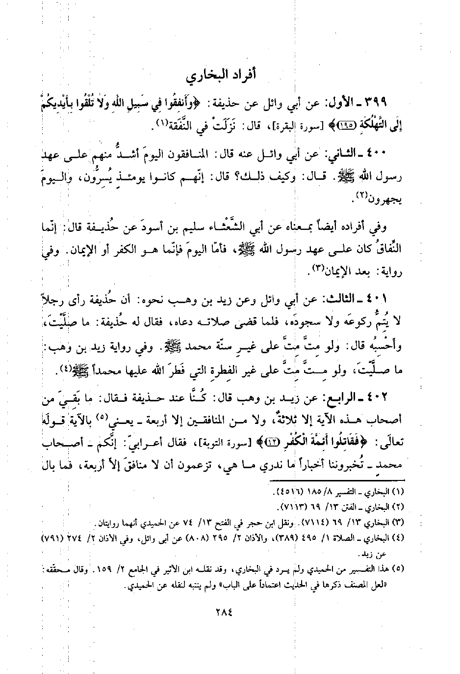 399 - الأول: عَن أبي وَائِل عَن حُذَيْفَة: {وأنفقوا فِي سَبِيل الله وَلَا تلقوا بِأَيْدِيكُمْ إِلَى التَّهْلُكَة} [سُورَة الْبَقَرَة] ، قَالَ: نزلت فِي النَّفَقَة.