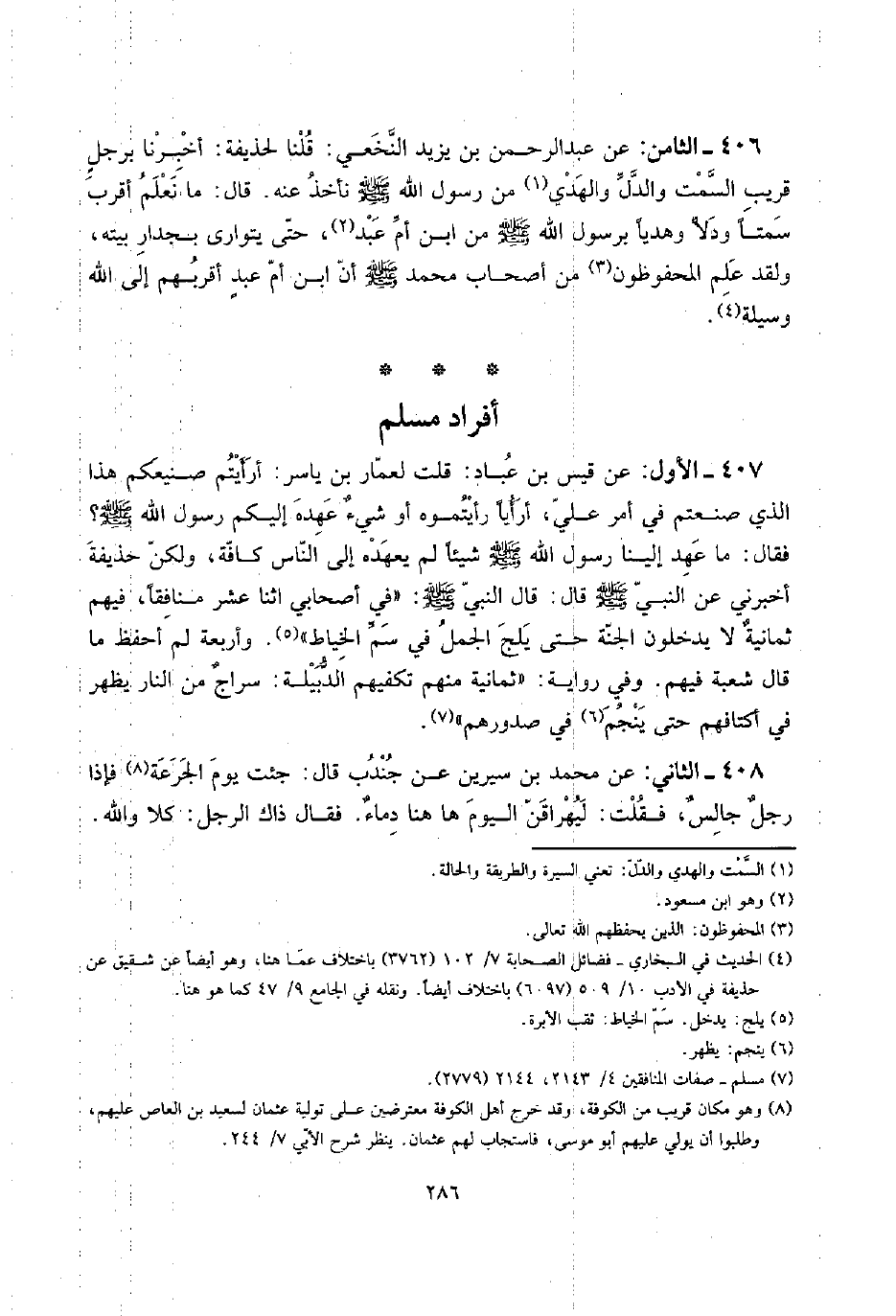 406 - الثَّامِن: عَن عبد الرَّحْمَن بن يزِيد النَّخعِيّ: قُلْنَا لِحُذَيْفَة: أخبرنَا برجلٍ قريب السمت والدل وَالْهَدْي من رَسُول الله صلى الله عَلَيْهِ وَسلم نَأْخُذ عَنهُ. قَالَ: مَا نعلم أقرب سمتاً ودلاً وهدياً برَسُول الله صلى الله عَلَيْهِ وَسلم من ابْن أم عبد، حَتَّى يتَوَارَى بجدار بَيته، وَلَقَد علم المحفوظون من أَصْحَاب مُحَمَّد صلى الله عَلَيْهِ وَسلم أَن إِبْنِ أم عبدٍ أقربهم إِلَى الله وَسِيلَة.