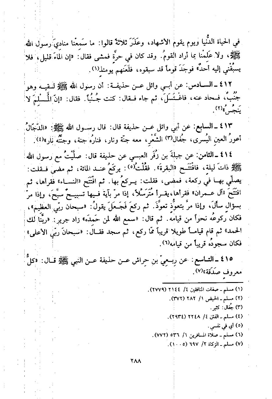 414 - الثَّامِن: عَن جبلة بن زفر الْعَبْسِي عَن حُذَيْفَة قَالَ: صليت مَعَ رَسُول الله صلى الله عَلَيْهِ وَسلم ذَات ليلةٍ، فَافْتتحَ " الْبَقَرَة ". فَقلت: يرْكَع عِنْد الْمِائَة، ثمَّ مضى فَقلت: يُصَلِّي بهَا فِي رَكْعَة، فَمضى، فَقلت: يرْكَع بهَا. ثمَّ افْتتح " النِّسَاء " فقرأها، ثمَّ افْتتح " آل عمرَان " فقرأها، يقْرَأ مترسلاً، إِذا مر بِآيَة فِيهَا تسبيحٌ سبح، وَإِذا مر بسؤالٍ سَأَلَ، وَإِذا مر بتعوذٍ تعوذ. ثمَّ ركع فَجعل يَقُول: " سُبْحَانَ رَبِّي الْعَظِيم "، فَكَانَ رُكُوعه نَحوا من قِيَامه. ثمَّ قَالَ: " سمع الله لمن حَمده " زَاد جرير: " رَبنَا لَك الْحَمد " ثمَّ قَامَ قيَاما طَويلا قَرِيبا مِمَّا ركع، ثمَّ سجد فَقَالَ: " سُبْحَانَ رَبِّي الْأَعْلَى " فَكَانَ سُجُوده قَرِيبا من قِيَامه.