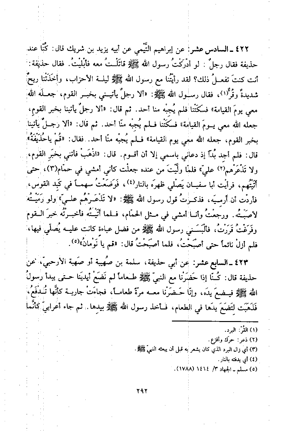 422 - السَّادِس عشر: عَن إِبْرَاهِيم التَّيْمِيّ عَن أَبِيه يزِيد بن شريك قَالَ: كُنَّا عِنْد حُذَيْفَة فَقَالَ رجلٌ لَو أدْركْت رَسُول الله صلى الله عَلَيْهِ وَسلم قَاتَلت مَعَه فأبليت. فَقَالَ حُذَيْفَة: أَنْت كنت تفعل ذَلِك؟ لقد رَأَيْتنَا مَعَ رَسُول الله صلى الله عَلَيْهِ وَسلم لَيْلَة الْأَحْزَاب، وأخذتنا ريحٌ شديدةٌ وقرٌّ، فَقَالَ رَسُول الله صلى الله عَلَيْهِ وَسلم: " أَلا رجلٌ يأتيني بِخَبَر الْقَوْم، جعله الله معي يَوْم الْقِيَامَة " فسكتنا فَلم يجبهُ منا أحد. ثمَّ قَالَ: " أَلا رجلٌ يأتينا بِخَبَر الْقَوْم، جعله الله معي يَوْم الْقِيَامَة " فسكتنا فَلم يجبهُ منا أحد. ثمَّ قَالَ: " أَلا رجلٌ يأتينا بِخَبَر الْقَوْم، جعله الله معي يَوْم الْقِيَامَة " فَلم يجبهُ منا أحد. فَقَالَ: " قُم يَا حُذَيْفَة " قَالَ: فَلم أجد بدا إِذْ دَعَاني باسمي إِلَّا أَن أقوم. قَالَ: " اذْهَبْ فأتني بِخَبَر الْقَوْم، وَلَا تذعرهم عَليّ " فَلَمَّا وليت من عِنْده جعلت كَأَنِّي أَمْشِي فِي حمام، حَتَّى أتيتهم، فَرَأَيْت أَبَا سُفْيَان يُصَلِّي ظَهره بالنَّار، فَوضعت سَهْما فِي كبد الْقوس، فَأَرَدْت أَن أرميه، فَذكرت قَول رَسُول الله صلى الله عَلَيْهِ وَسلم: " لَا تذعرهم عَليّ " وَلَو رميته لأصبته. وَرجعت وَأَنا أَمْشِي فِي مثل الْحمام، فَلَمَّا أَتَيْته فَأَخْبَرته خبر الْقَوْم وفرغت قررت، فألبسني رَسُول الله صلى الله عَلَيْهِ وَسلم من فضل عباءة كَانَت عَلَيْهِ يُصَلِّي فِيهَا، فَلم أزل نَائِما حَتَّى أَصبَحت، فَلَمَّا أَصبَحت قَالَ: " قُم يَا نومان ".