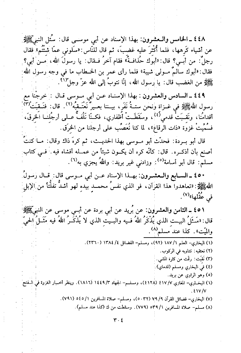 450 - السَّابِع وَالْعشْرُونَ: بِهَذَا الْإِسْنَاد عَن أبي مُوسَى قَالَ: قَالَ رَسُول الله صلى الله عَلَيْهِ وَسلم: " تَعَاهَدُوا هَذَا الْقُرْآن، فوالذي نفس محمدٍ بِيَدِهِ لَهو أَشد تفلتاً من الْإِبِل فِي عقلهَا ".