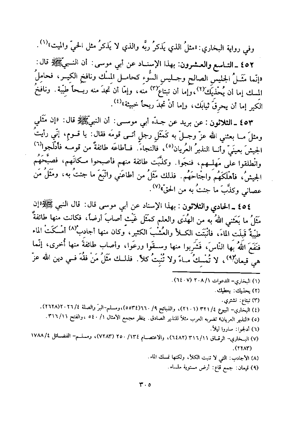454 - الْحَادِي وَالثَّلَاثُونَ: بِهَذَا الْإِسْنَاد عَن أبي مُوسَى قَالَ: قَالَ النَّبِي صلى الله عَلَيْهِ وَسلم " إِن مثل مَا بَعَثَنِي الله بِهِ من الْهدى وَالْعلم كَمثل غيثٍ أصَاب أَرضًا، فَكَانَت مِنْهَا طائفةٌ طيبةٌ قبلت المَاء، فأنبتت الْكلأ والعشب الْكثير، وَكَانَ مِنْهَا أجادب أَمْسَكت المَاء فنفع الله بهَا النَّاس، فَشَرِبُوا مِنْهَا وَسقوا ورعوا، وَأصَاب طَائِفَة مِنْهَا أُخْرَى، إِنَّمَا هِيَ قيعانٌ، لَا تمسك مَاء وَلَا تنْبت كلأ. فَذَلِك مثل من فقه فِي دين الله عز
