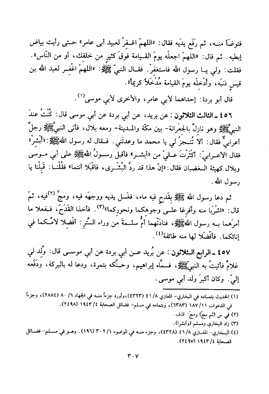 456 - الثَّالِث وَالثَّلَاثُونَ: عَن بريد، عَن أبي بردة عَن أبي مُوسَى قَالَ: كنت عِنْد النَّبِي صلى الله عَلَيْهِ وَسلم وَهُوَ نازلٌ بالجعرانة - بَين مَكَّة وَالْمَدينَة - وَمَعَهُ بِلَال، فَأتى النَّبِي صلى الله عَلَيْهِ وَسلم رجلٌ أعرابيٌّ فَقَالَ: أَلا تنجز لي يَا مُحَمَّد مَا وَعَدتنِي. فَقَالَ لَهُ رَسُول الله صلى الله عَلَيْهِ وَسلم: " أبشر " فَقَالَ الْأَعرَابِي: أكثرت عَليّ من " أبشر " فَأقبل رَسُول الله صلى الله عَلَيْهِ وَسلم على أبي مُوسَى وبلال كَهَيئَةِ الغضبان فَقَالَ: " إِن هَذَا قد رد الْبُشْرَى، فاقبلا أَنْتُمَا " فَقُلْنَا: قبلنَا يَا رَسُول الله.