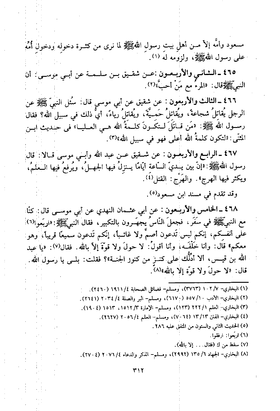 468 - الْخَامِس وَالْأَرْبَعُونَ: عَن أبي عُثْمَان النَّهْدِيّ عَن أبي مُوسَى قَالَ: كُنَّا مَعَ النَّبِي صلى الله عَلَيْهِ وَسلم فِي سفر، فَجعل النَّاس يجهرون بِالتَّكْبِيرِ، فَقَالَ النَّبِي صلى الله عَلَيْهِ وَسلم: " اربعوا على أَنفسكُم، إِنَّكُم لَيْسَ تدعون أَصمّ وَلَا غَائِبا، إِنَّكُم تدعون سمعياً قَرِيبا، وَهُوَ مَعكُمْ " قَالَ: وَأَنا خَلفه، وَأَنا أَقُول: لَا حول وَلَا قُوَّة إِلَّا بِاللَّه. فَقَالَ: " يَا عبد الله بن قيس، أَلا أدلك على كنزٍ من كنوز الْجنَّة "؟ فَقلت: بلَى يَا رَسُول الله.