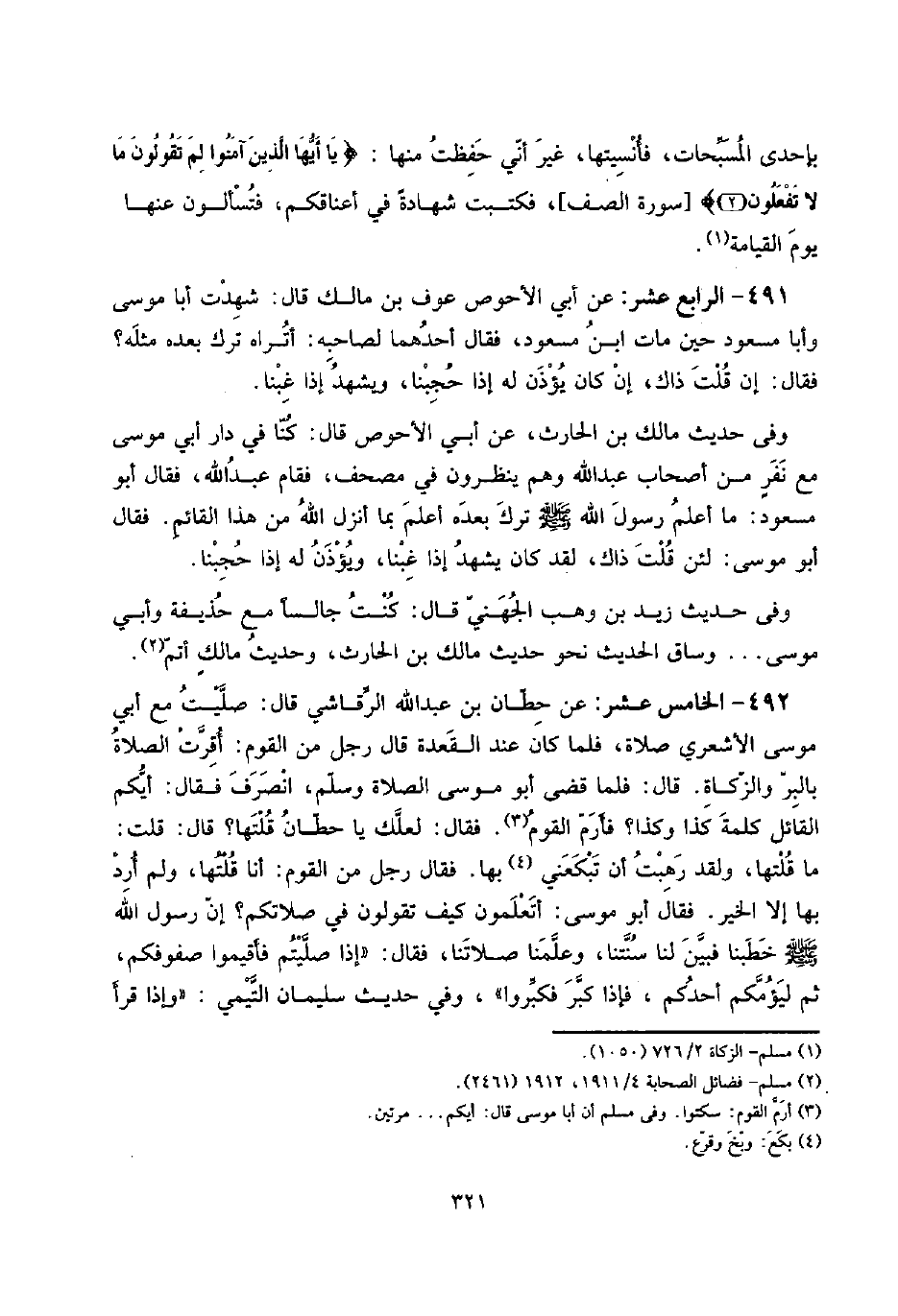 492 - الْخَامِس عشر: عَن حطَّان بن عبد الله الرقاشِي قَالَ: صليت مَعَ أبي مُوسَى الْأَشْعَرِيّ صَلَاة، فَلَمَّا كَانَ عِنْد الْقعدَة قَالَ رجل من الْقَوْم: أقرَّت الصَّلَاة بِالْبرِّ وَالزَّكَاة. قَالَ: فَلَمَّا قضى أَبُو مُوسَى الصَّلَاة وَسلم، انْصَرف فَقَالَ: أَيّكُم الْقَائِل كلمة كَذَا وَكَذَا؟ فأرم الْقَوْم. فَقَالَ: لَعَلَّك يَا حطَّان قلتهَا؟ قَالَ: قلت: مَا قلتهَا، وَلَقَد رهبت أَن تبكعني بهَا. فَقَالَ رجل من الْقَوْم: أَنا قلتهَا، وَلم أرد بهَا إِلَّا الْخَيْر. فَقَالَ أَبُو مُوسَى: أتعلمون كَيفَ تَقولُونَ فِي صَلَاتكُمْ؟ إِن رَسُول الله صلى الله عَلَيْهِ وَسلم خَطَبنَا فَبين لنا سنتنا، وَعلمنَا صَلَاتنَا، فَقَالَ: " إِذا صليتم فأقيموا صفوفكم، ثمَّ ليؤمكم أحدكُم، فَإِذا كبر فكبروا "، وَفِي حَدِيث سُلَيْمَان التَّيْمِيّ: " وَإِذا قَرَأَ