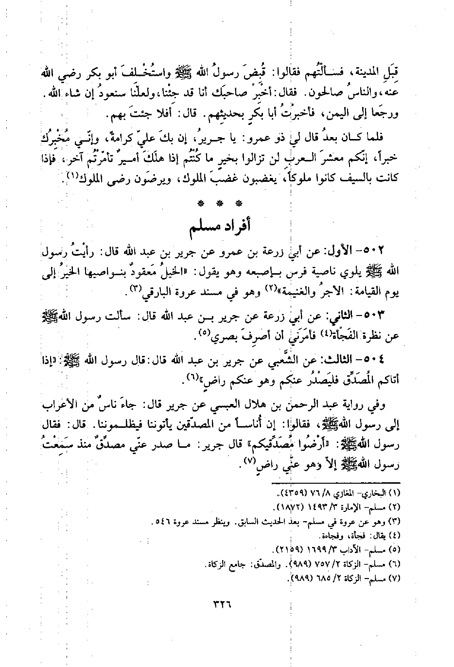 502 - الأول: عَن أبي زرْعَة بن عَمْرو عَن جرير بن عبد الله قَالَ: رَأَيْت رَسُول الله صلى الله عَلَيْهِ وَسلم يلوي نَاصِيَة فرس بإصبعه وَهُوَ يَقُول: " الْخَيل معقودٌ بنواصيها الْخَيْر إِلَى يَوْم الْقِيَامَة: الْأجر وَالْغنيمَة وَهُوَ فِي مُسْند عُرْوَة الْبَارِقي.