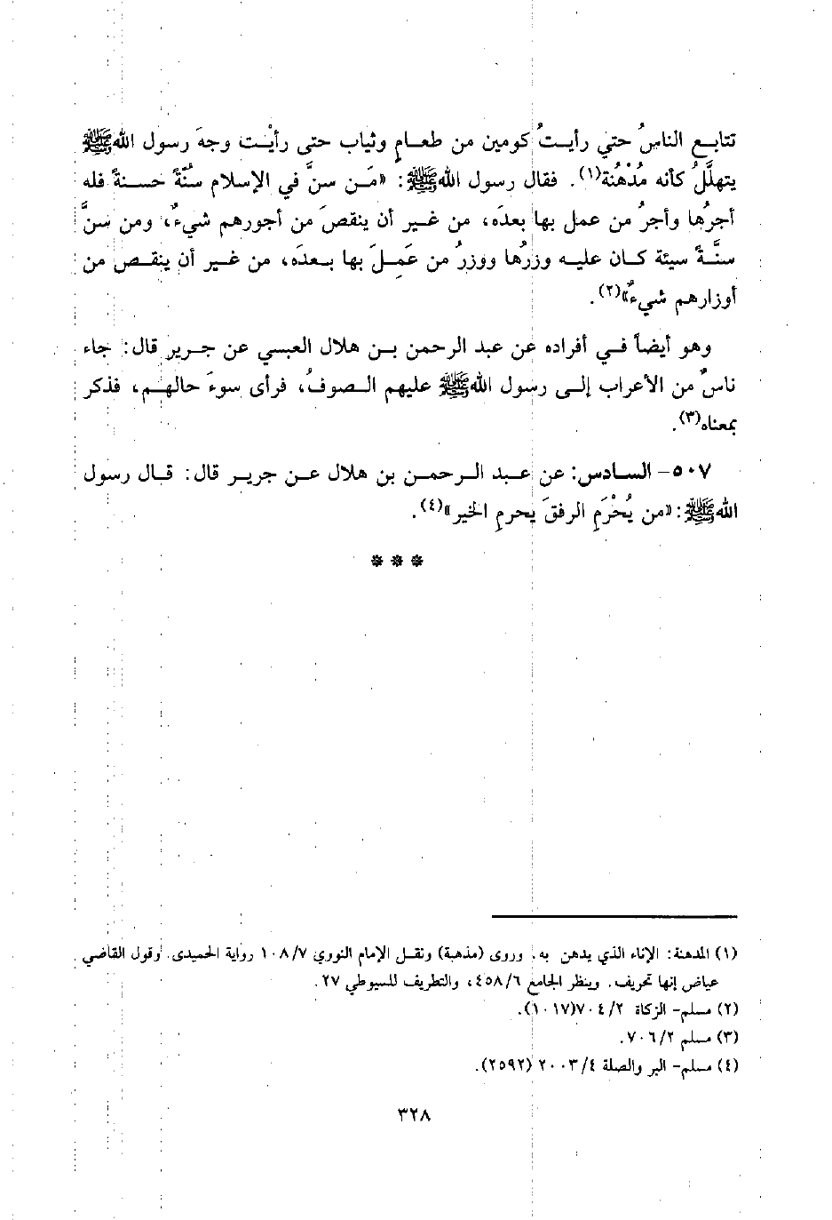 507 - السَّادِس: عَن عبد الرَّحْمَن بن هِلَال عَن جرير قَالَ: قَالَ رَسُول الله صلى الله عَلَيْهِ وَسلم: " من يحرم الرِّفْق يحرم الْخَيْر ".